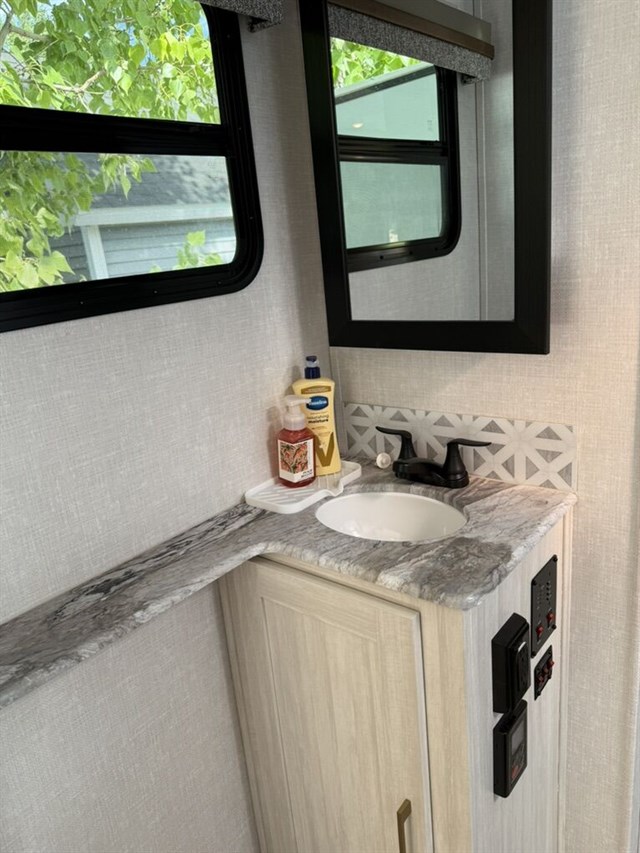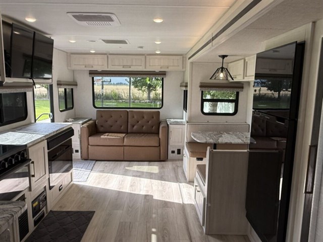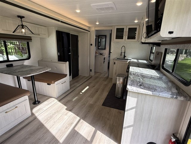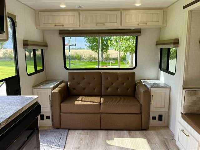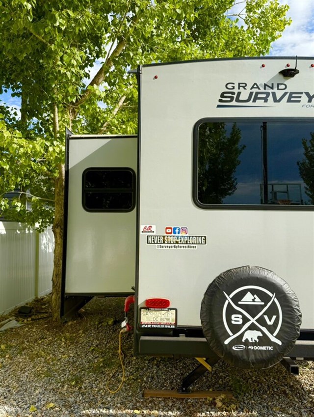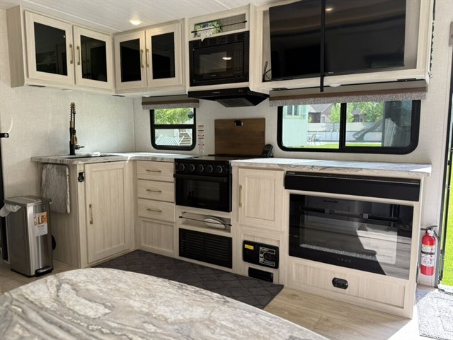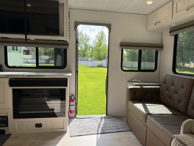 Mint Condition! We just purchased this brand new last month and it was used only once for two nights. This trailer is still pristine with additional upgrades added. Upgrades that we added to this trailer include: Ceramic protection coating on the entire exterior, Scotch-guard on all the fabric on the interior, integrated backup camera and a 24 inch television in the master bedroom. Other great features include: TPMS system with monitor, central vacuum, electric fireplace, large TV in the kitchen living area, large 12 Volt 10 ft.³ fridge and freezer(which runs completely off the solar power panels), a ton of extra counter space, gas stove, as well as an oven with a microwave above and an exhaust fan. A large pop out that makes the living area abundantly roomy. In the living area, both the sofa and the booth convert into beds. All of the windows have convenient roll-up blinds. And exterior kitchen area with a mini fridge outside as well as a small hose connection for spraying off dirty dishes, or children’s dirty feet. And exterior kitchen area with a mini fridge outside as well as a small hose connection for spraying off dirty dishes, or children’s dirty feet. Large retractable awning with running LED lighting. This trailer is 32 feet long and weighs approximately. The trailer sleeps 5 with a lot of floor space for more and weighs 6368 lbs dry. It is also equipped with an electric hitch with light and electric stabilizer jacks. Also, brand new $500+ hitch included.