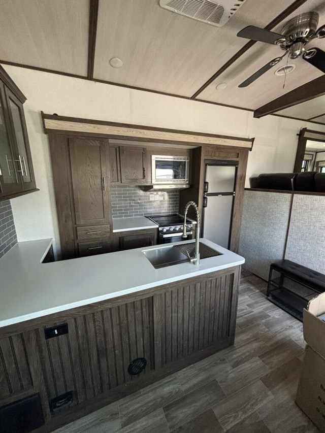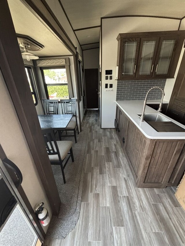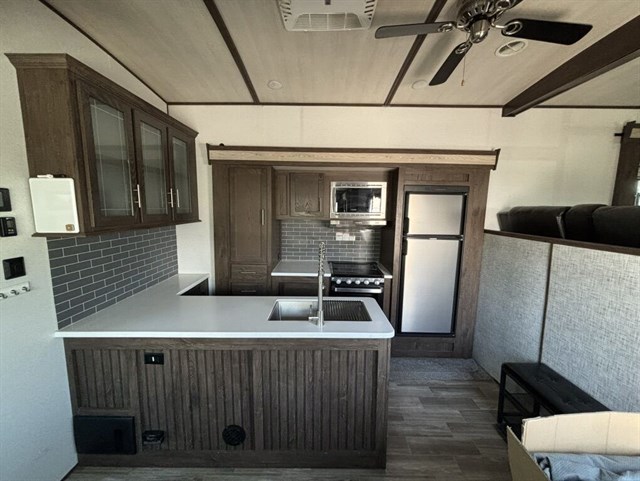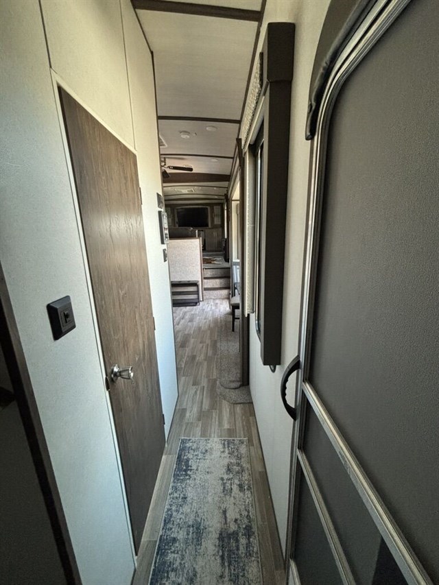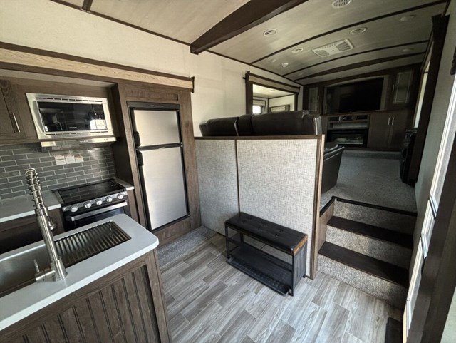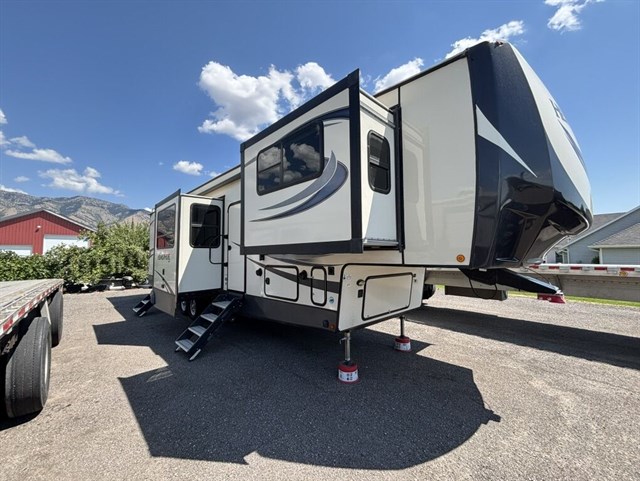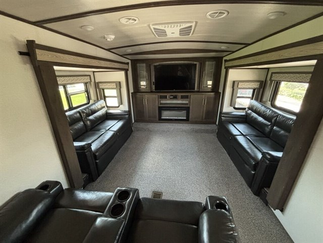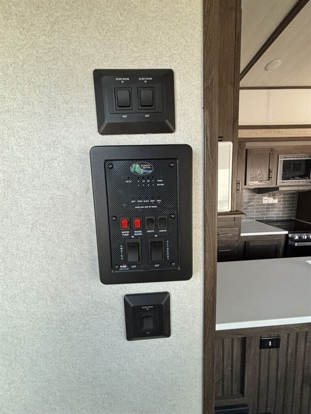 5 separate powered slide-outs. Also, includes a super convenient auto-leveling feature. You’ll notice a large box in the kitchen. That is a cover for the 5th wheel. We already also including a new Anderson hitch (everything needed to hook to your truck!).