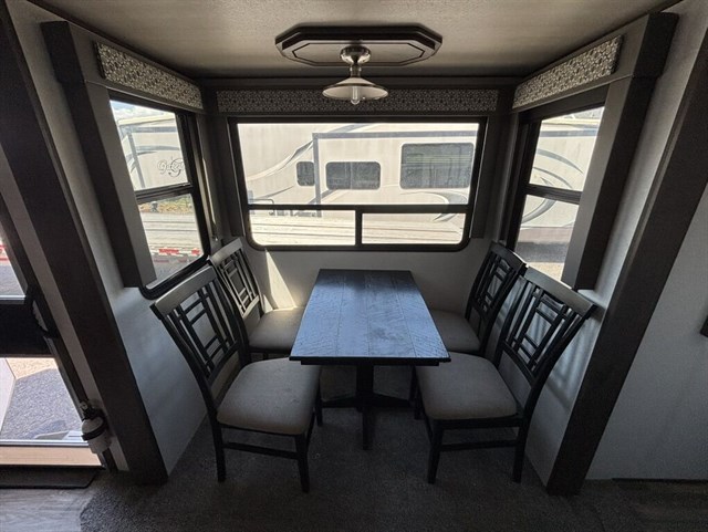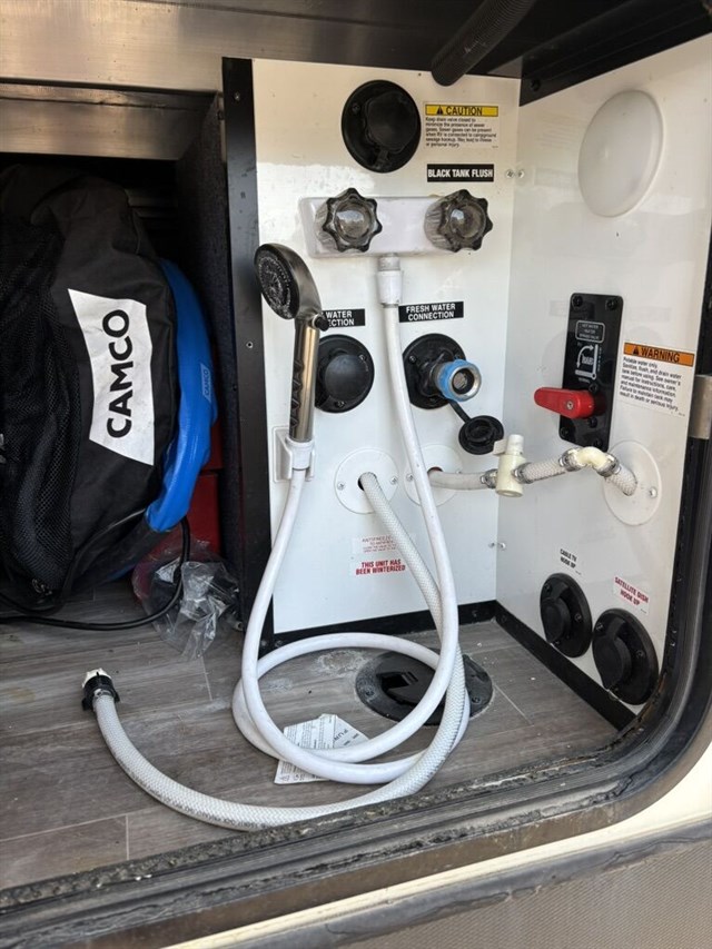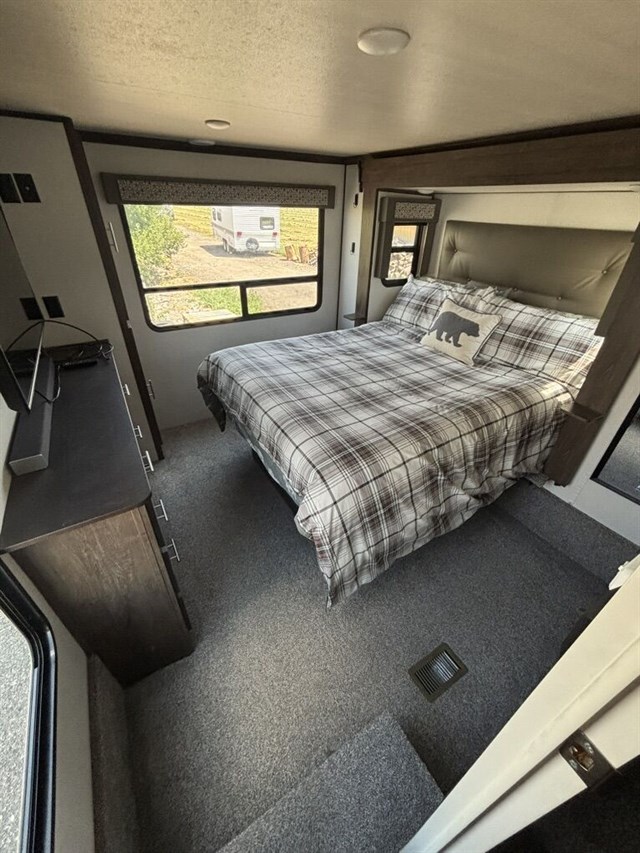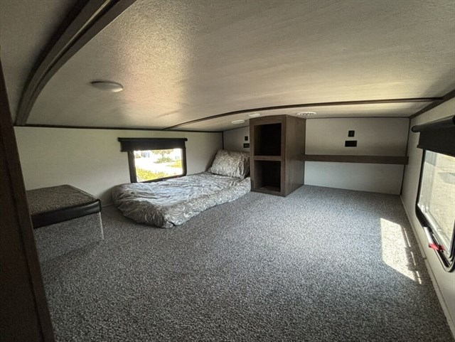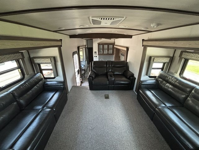 We recently had it serviced and tuned everything up virtually as good as new. We even installed brand new batteries. We had a smaller bumper pull that we sold to get this model which we have just loved with the U-shaped entertainment configuration up front with built in power recliners. Full queen size bed with upgraded mattress. Loft up top with two twin mattresses. Refrigerator is an upgraded / hard to find propane powered refrigerator so you can use it “off the grid” or it can use traditional power if you’re hooked up. Huge bathroom with shower. Two separate doors (which is super convenient where if you need to pull over for the night you have access to the main bedroom and bathroom without having to extend out any of the slide outs.