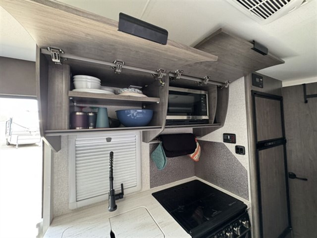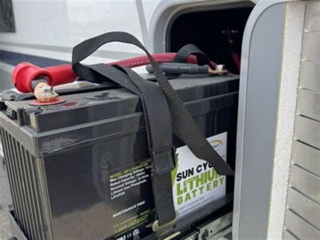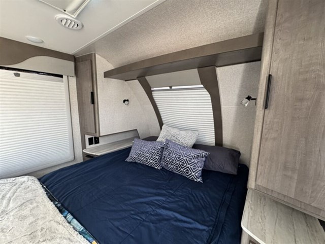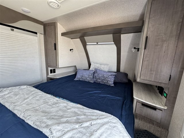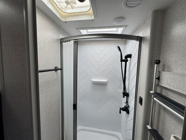 This one is a true Four-Season package and we added all the right upgrades: dual lithium batteries, roof-mounted solar + plug-in port, 1500W inverter, and the shock absorber suspension package for a smoother tow. IT will also come with a stabilizer hitch for butter smooth road travel.