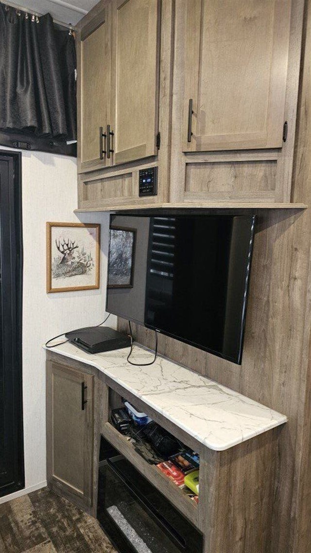Very nice one owner Platinum Edition toy hauler, just over 40 foot in length. Upgraded solar kit to keep your batteries charged while camping off grid. 13 foot garage for the toys, and happy jack sofas in the garage that also covert to a bed. Sleeps 9 people comfortably.