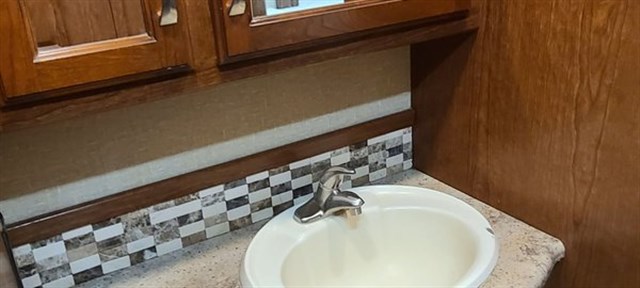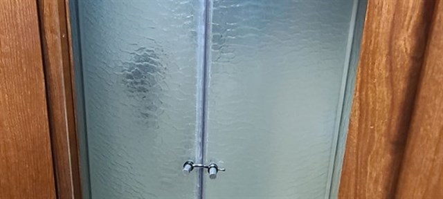 The bathroom has a private toilet and shower area on one side of the motor home. On the opposite side there is a sink and medicine cabinet.