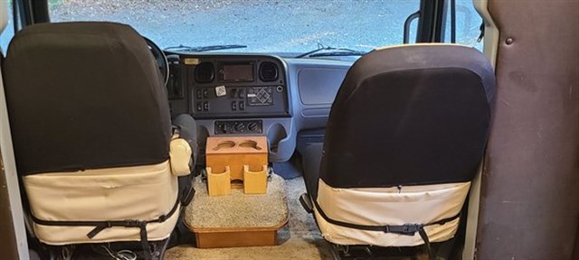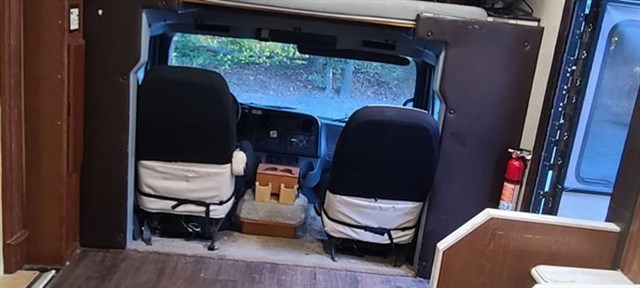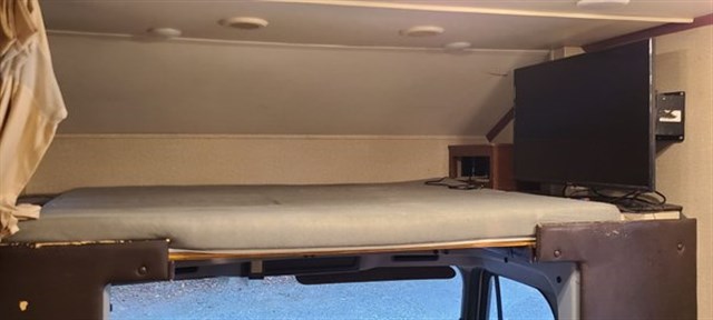 Above the cab, the cab over bunk provides additional sleeping space. There is also a 39" TV on an electric swivel bracket in the cab.