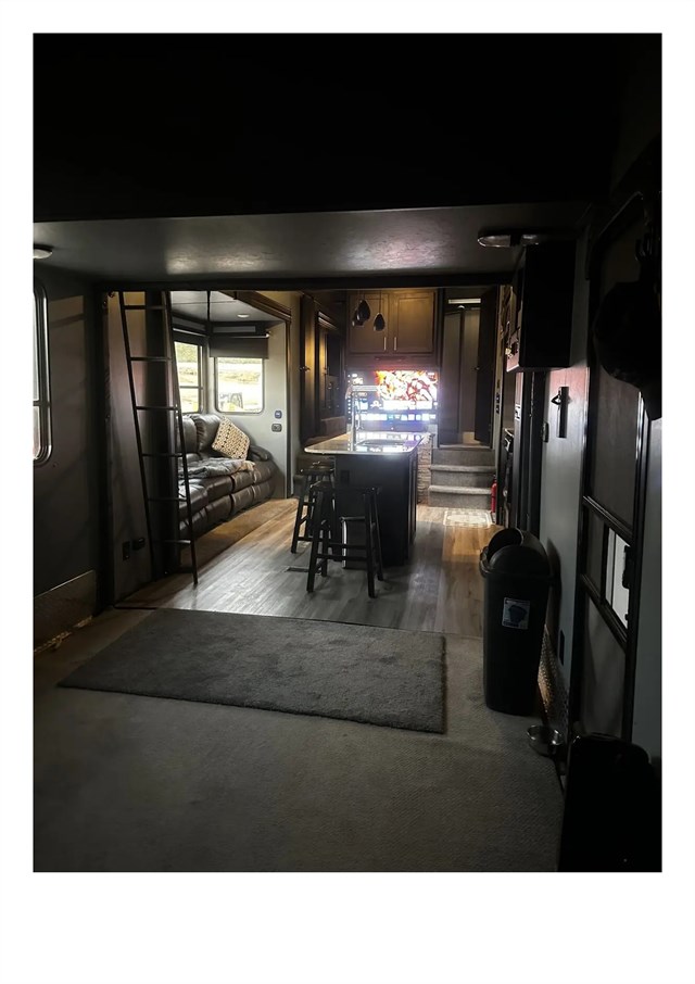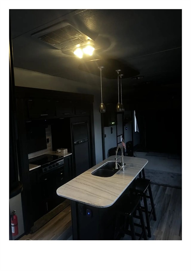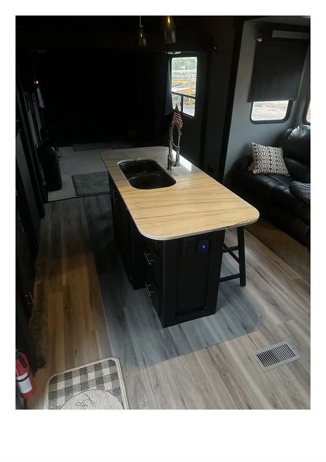 In the main living area there is a sofa slide with recliners. You will also find a pantry and another slide with a refrigerator, three burner range, and microwave. The kitchen island offers much counter space and a double kitchen sink. Along the front of the living area there is an entertainment center with a fireplace.