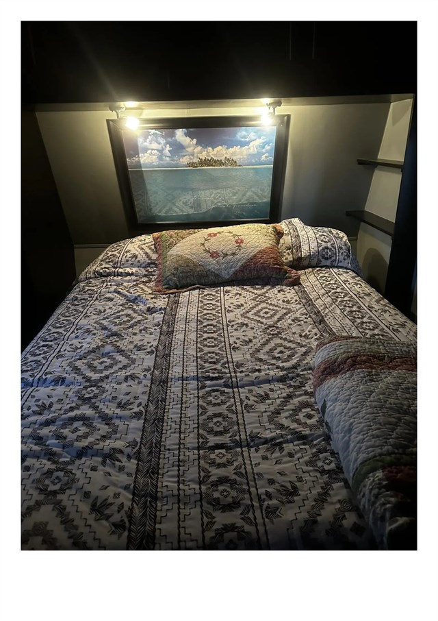 The front bedroom has a slide with two wardrobes and a dresser. You will also find a queen bed and a wardrobe on one side of the bed and a nightstand on the other side.