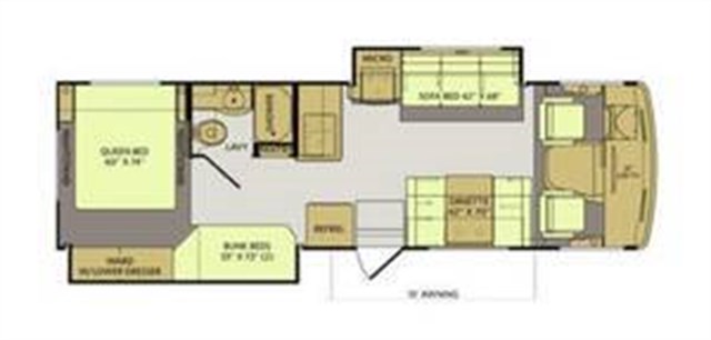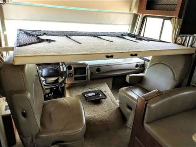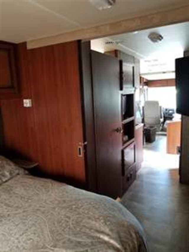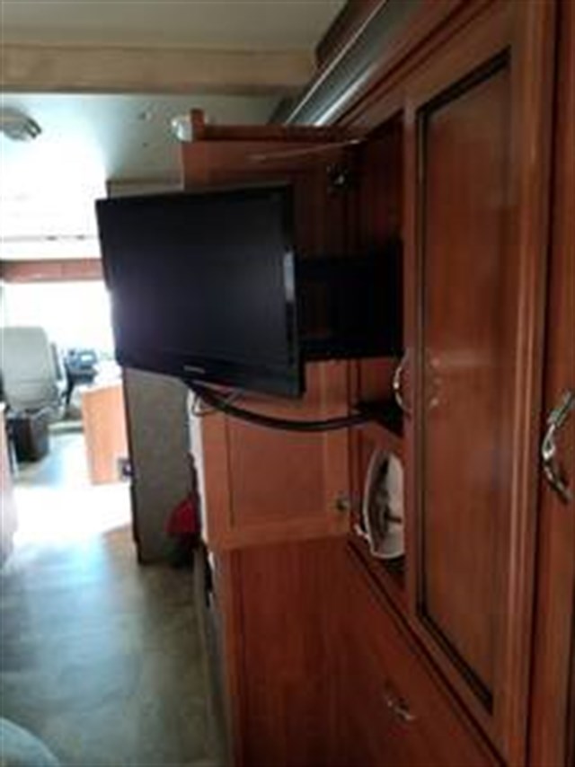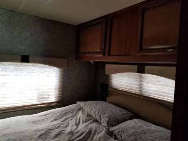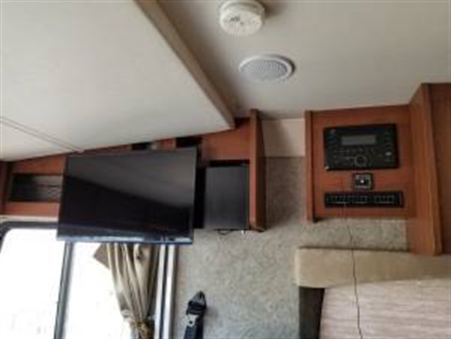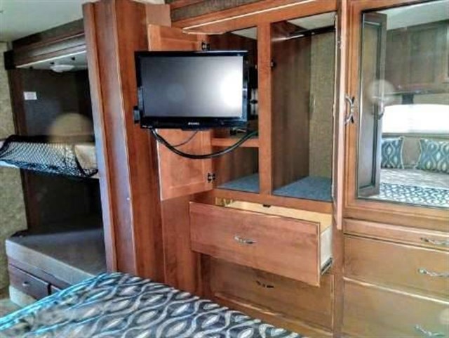 There are plenty of overhead cabinets throughout this motor home for storage. There are many options available on this motor home, such as a bedroom/bunk area 19" LED TV, dual panel bunk bed monitors, hide-a-loft drop-down queen bed with 29" LED TV, an entertainment center with 32" LED TV or a dinette with swing-down bunk.