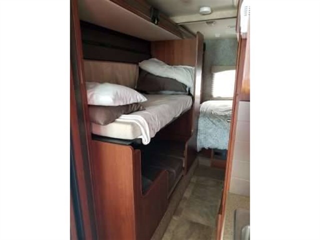 The Terra SE 31C motor home by Fleetwood features a set of bunk beds, which provides additional sleeping space for friends or family. The rear of the motor home has a queen bed and nightstands. There is a slide with a wardrobe, dresser, and bunk beds. Across the hall from the bunk beds is a bathroom with a toilet, sink, and shower.