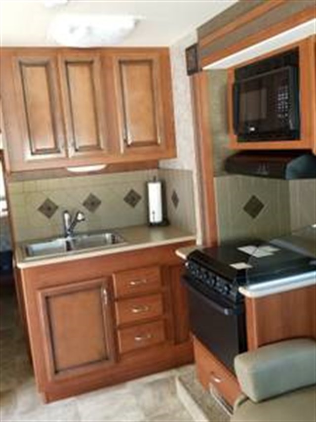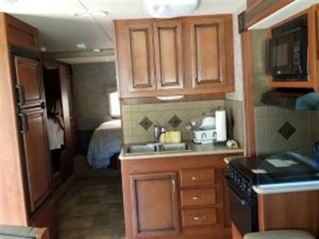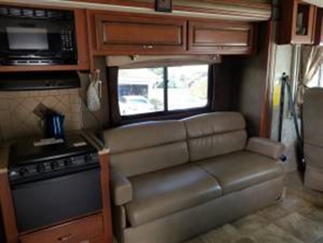 The kitchen and living area offer a pantry, double kitchen sink, refrigerator, and dinette. Behind the driver's seat is a second slide with a sofa bed, microwave, and three-burner range. The front overhead offers a 32" LED TV which can easily be viewed from anywhere in the front of the motor home.