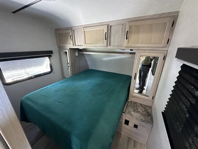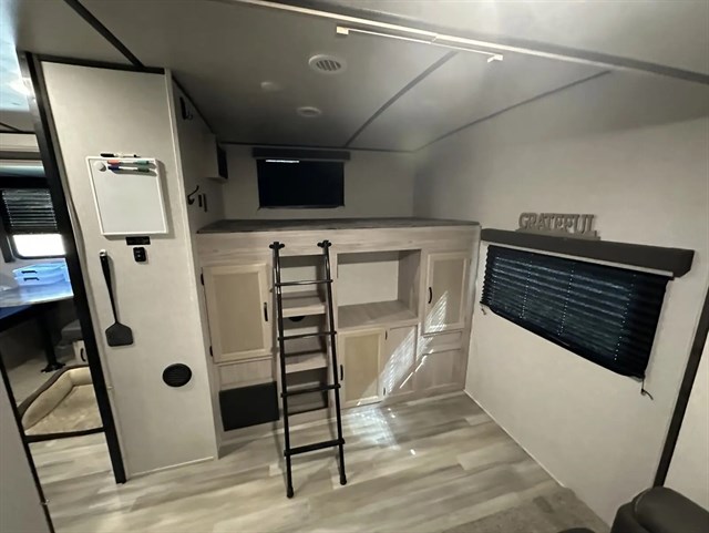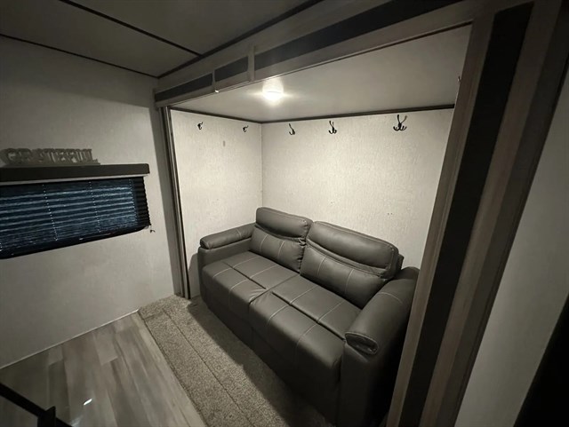 Experience the ultimate in privacy and convenience with our dedicated bunkhouse area. Perfectly suited for kids or additional guests, this separate space offers a cozy retreat for relaxation and rest. With its thoughtful design and comfortable amenities, our private bunkhouse ensures everyone enjoys a peaceful night's sleep. In the event you want to hit the road for longer travels the bunkhouse can allow for extra storage and clothing hangers. A door for privacy is available to reinstall if desired.