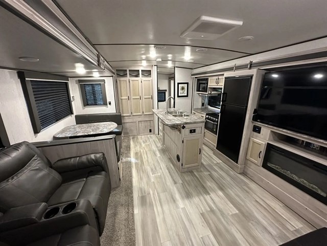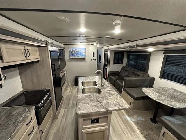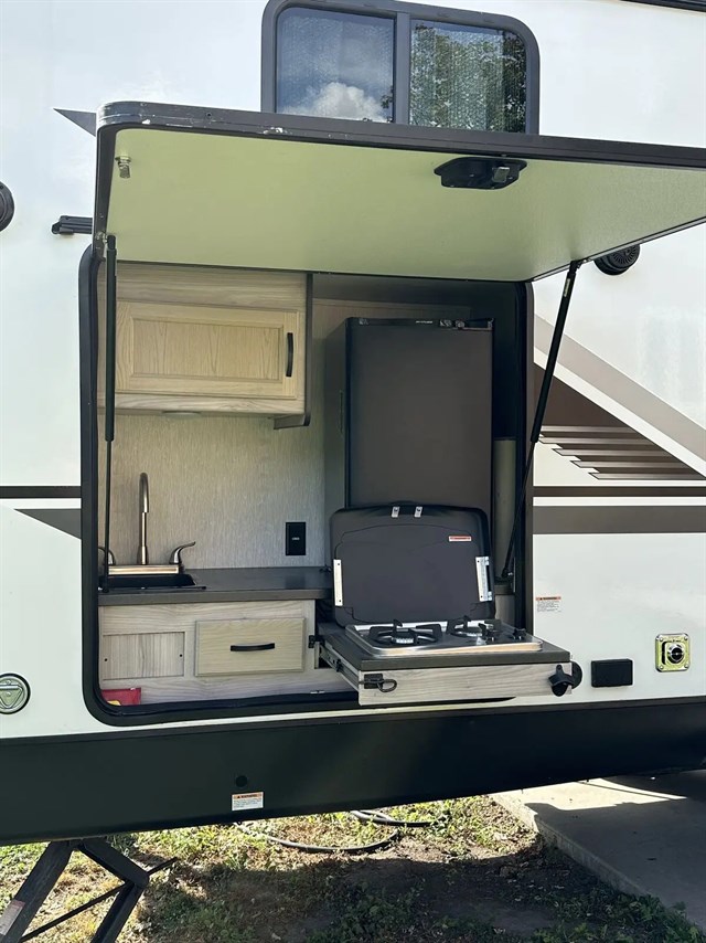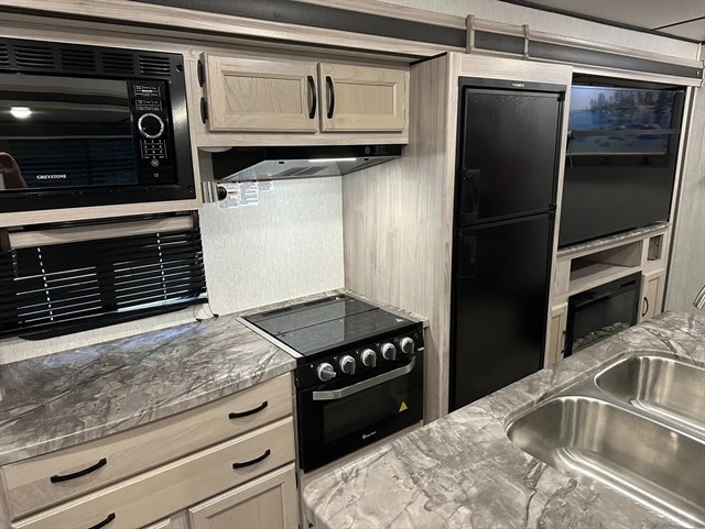 The spacious kitchen and food storage cabinets will make meal preparation a breeze! An outdoor kitchen with mini-fridge, slide-out stove top, and sink will add to outdoor cooking enjoyment. The 8 cubic foot refrigerator is the largest model available with electric & propane operation.