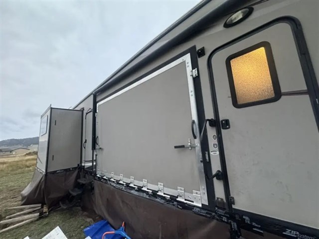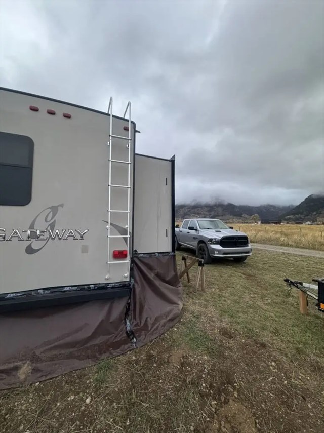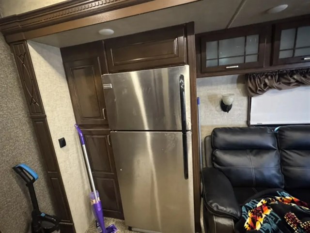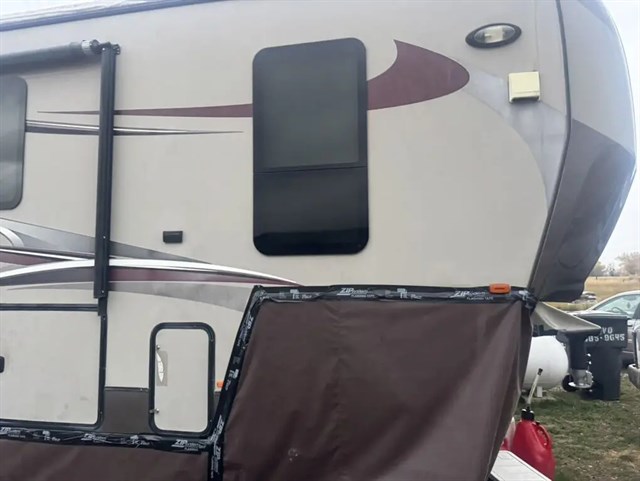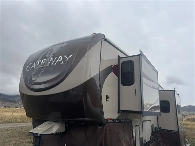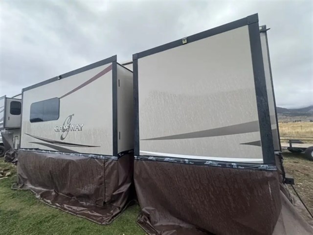 fifth wheel with a side patio, a dry weight of 13,420 lbs, and a length of approximately 41.9 feet. Key features include a dual-slide layout, a living area, a side and rear bunkhouse, a kitchen, and a master bedroom. It features two bathrooms, a fireplace, and seating for at least six, with sleeping capacity for seven.