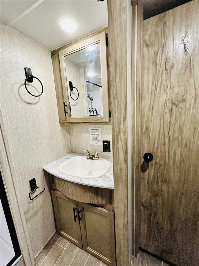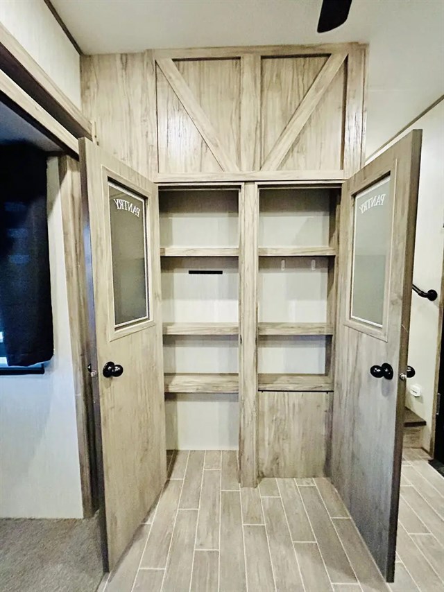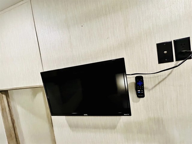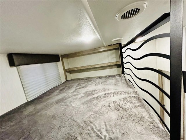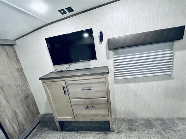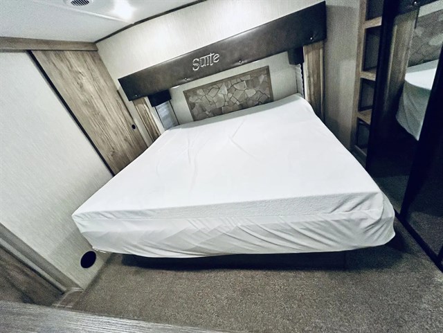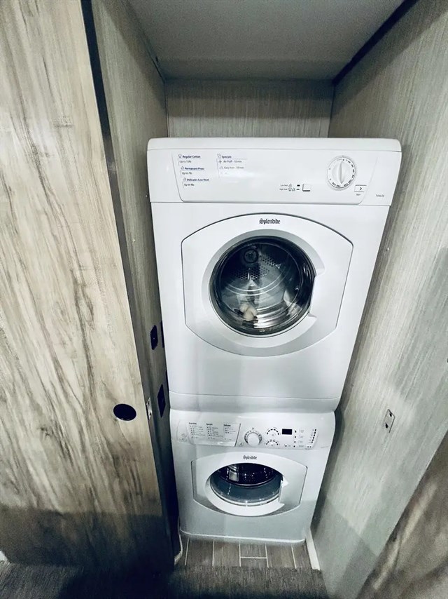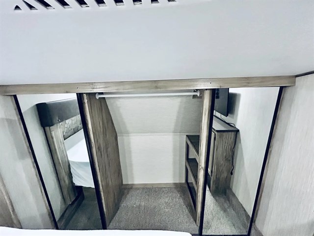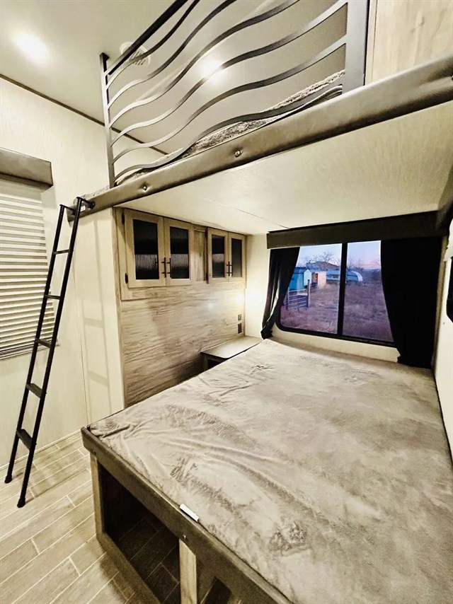 The layout offers two private bedrooms: a front master bedroom and a rear bedroom suite. The Master features an extra large bed with a private TV entertainment center, large mirrored closet, and a hidden washer dryer combo. Direct access to the full bathroom with shower and additional storage space promotes additional privacy and comfort.The rear suite includes a 54" x 74" bed, a wardrobe, a 60" x 80" loft bunk accessible by ladder, TV entertainment, its own half bathroom, and a second exterior entry door for added convenience.