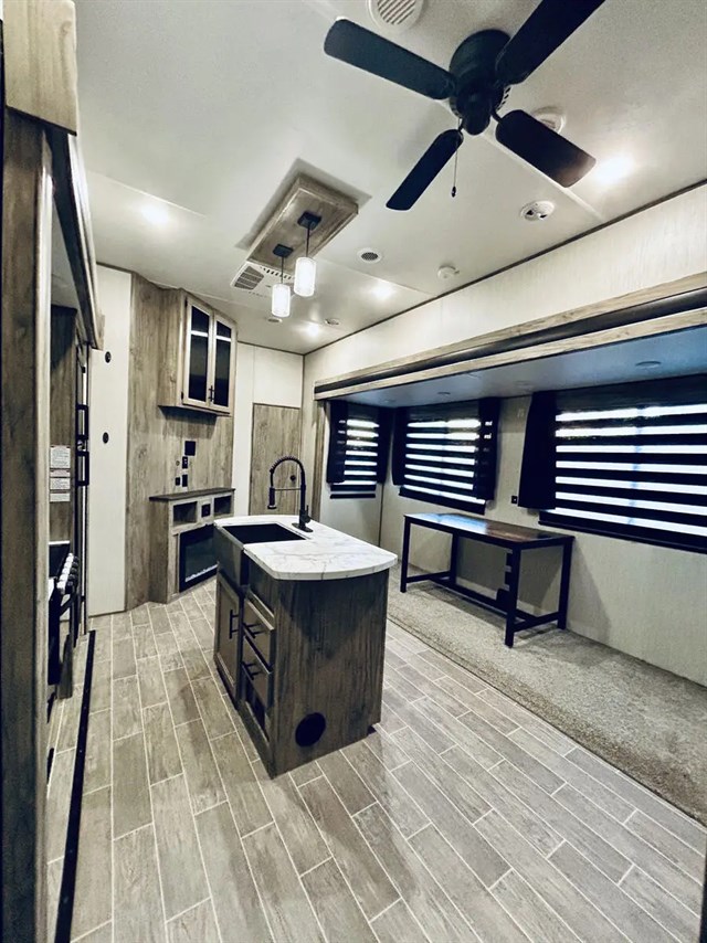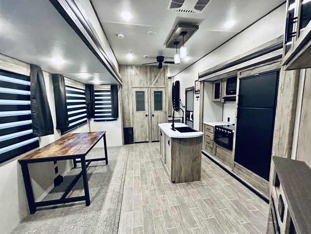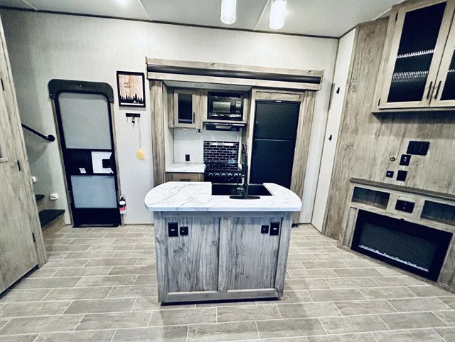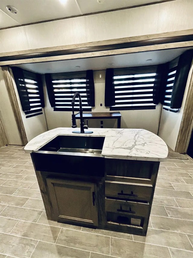 Features an island with a large sink for convenience. - Equipped with a stovetop, oven, microwave, refrigerator/freezer, and ample counter space and storage. - Generously sized Pantry Sleeping Arrangements: