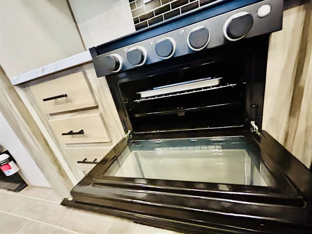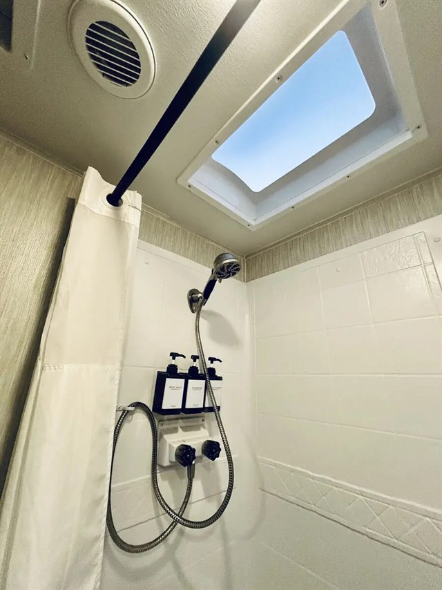 Two awnings for shaded outdoor living. - Outdoor kitchen complete with a sink, mini fridge, and grill for alfresco meals. - Spare tire kit for added security on the road. - Exterior shower with hot and cold water for convenience. Climate Comfort: