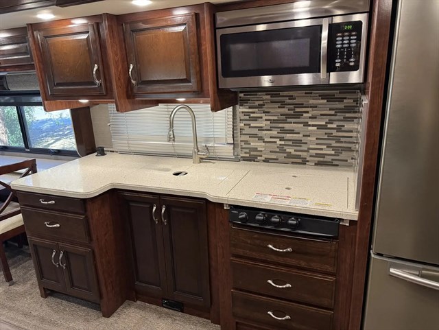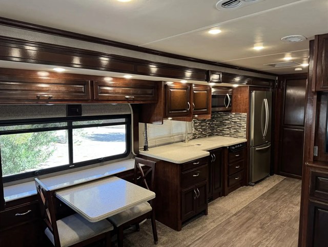Interior: Features include solid surface countertops, hand-crafted Maple cabinets, and an optional drop-down cabover bunk.