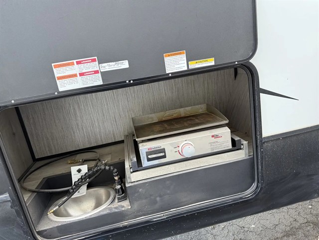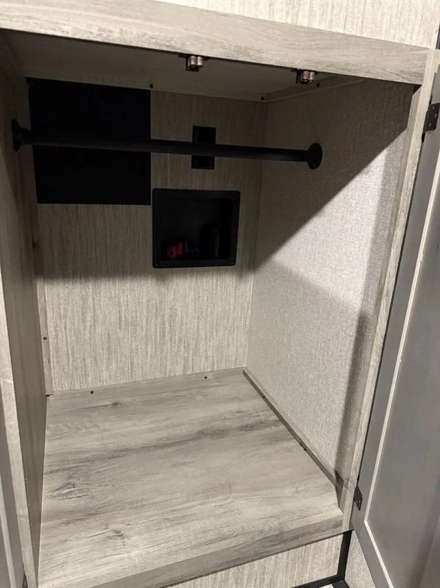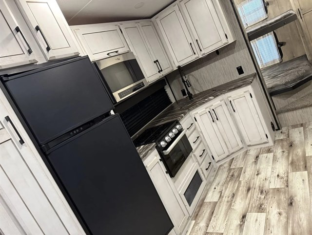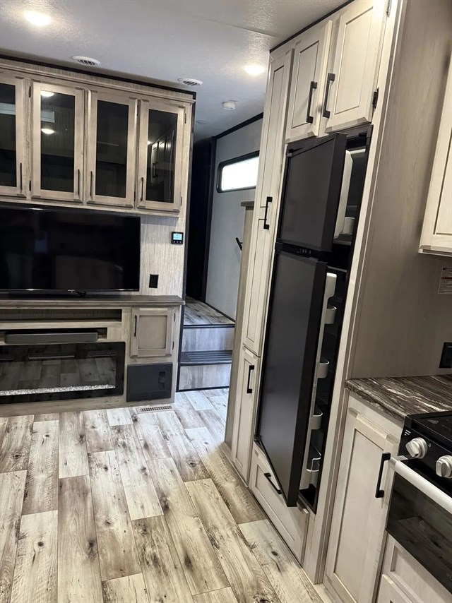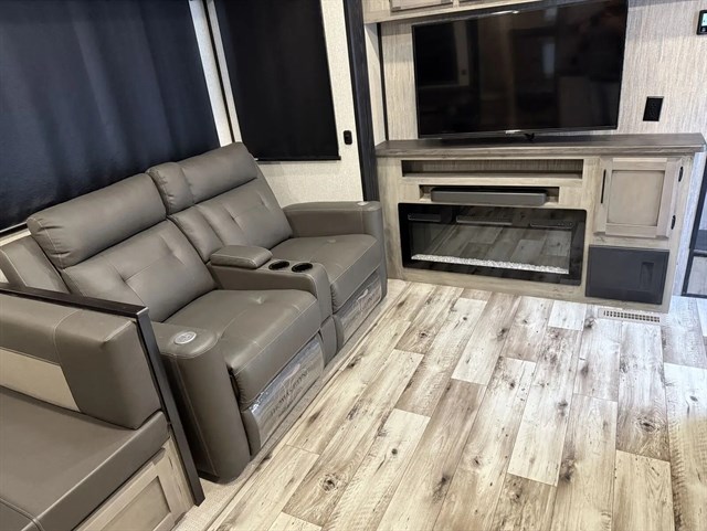 All of your friends and family can camp together in this fifth wheel! It features a rear private bunkhouse with a bunk above a hide-a-bed sofa, a full bathroom with a 30" x 36" shower, an entertainment center with wardrobes on either side, a folding bunk, and a bunk over the outside kitchen. Across from the hide-a-bed sofa is an entertainment center with a 40" fireplace and a 50" smart TV to watch your favorite movies at night. The kitchen island comes with two bar stools and you can prepare your best meals with the four burner range with a 24" oven. The second bathroom has a 48" x 30" residential shower with a seat and a linen closet to keep your towel close. Enjoy a good night's rest on the king bed slide in the front private bedroom which also has a dresser with a built-in hamper and a front wardrobe that is prepped to add an optional washer and dryer!