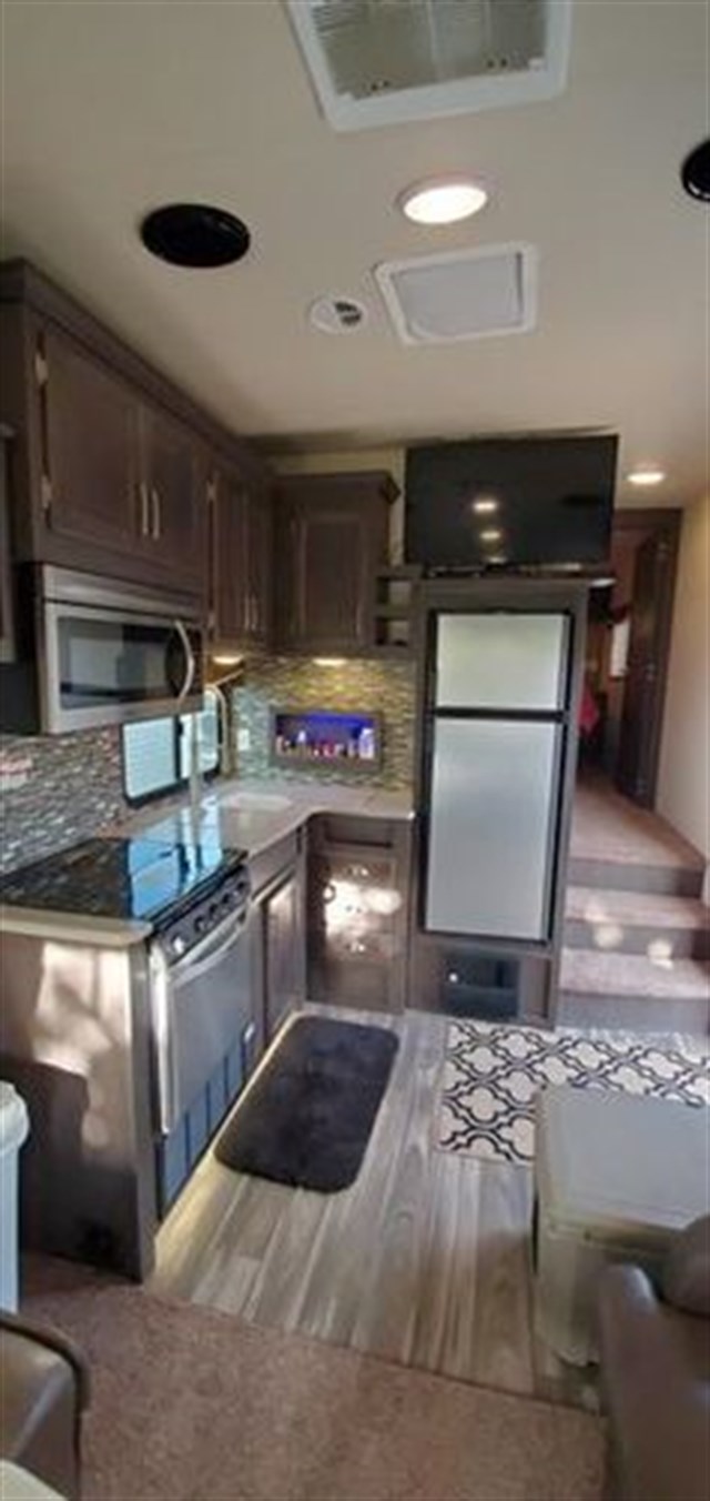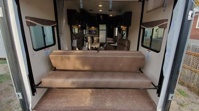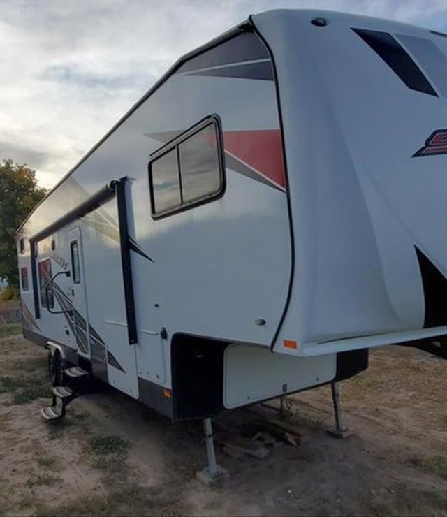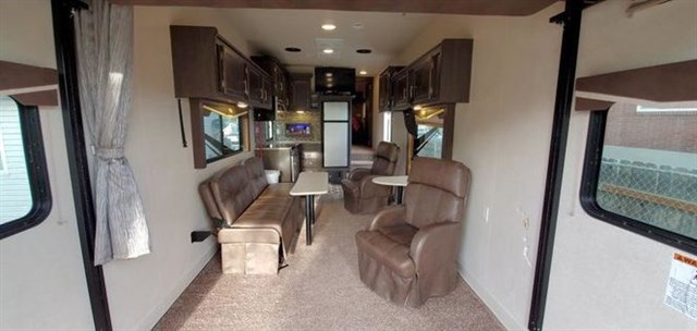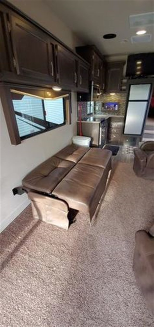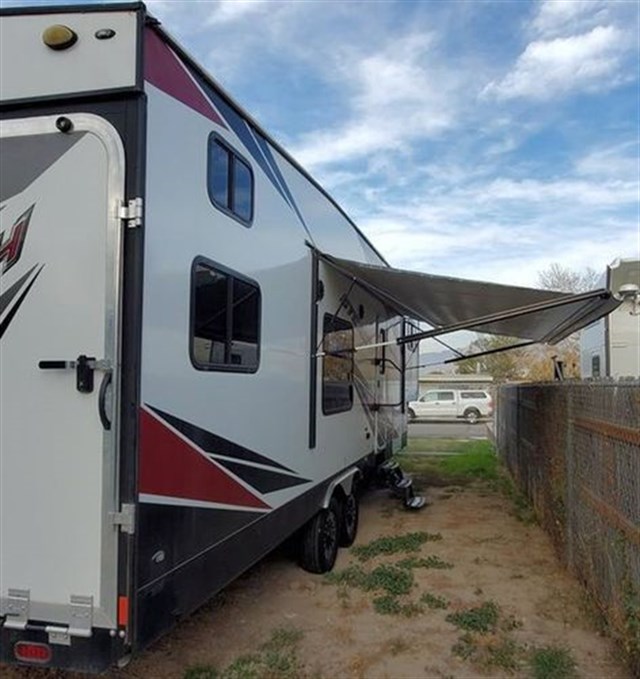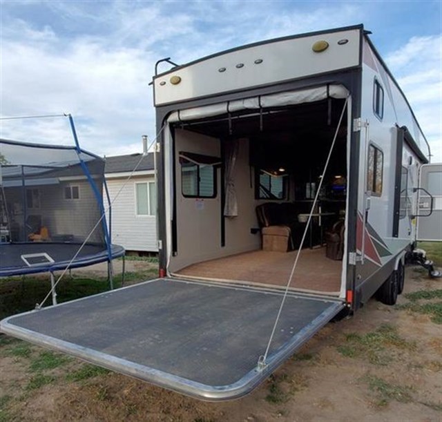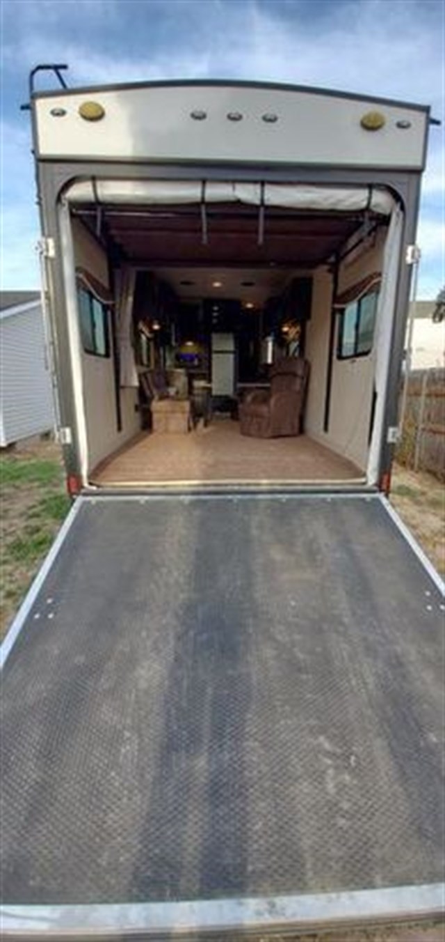 SA3320G series, 36 ft toy hauler with large cargo area, plenty of room for dirt bikes, for wheelers, or side by sides or whatever toys you choose! Kenwood sound system. Its in great condition well taken care of, new tires, solar panel and low hours on generator. Sleeps 7. It's very spacious, 150 gal water tank, gray 65 gal black 40, beautiful leather interior, tons of food storage cabinets and other storage compartments, something the whole family will enjoy! Gross weight is 15,000 lbs. Dry weight 9916. 2 brand new 6 volt batteries, outside shower, 39 inch tv, Electric awning with LED lighting, bluetooth, electric jacks and stabilizers in front and back!