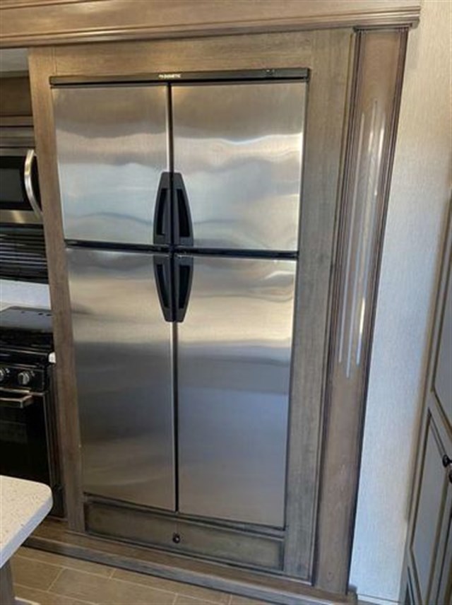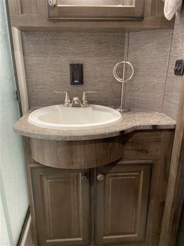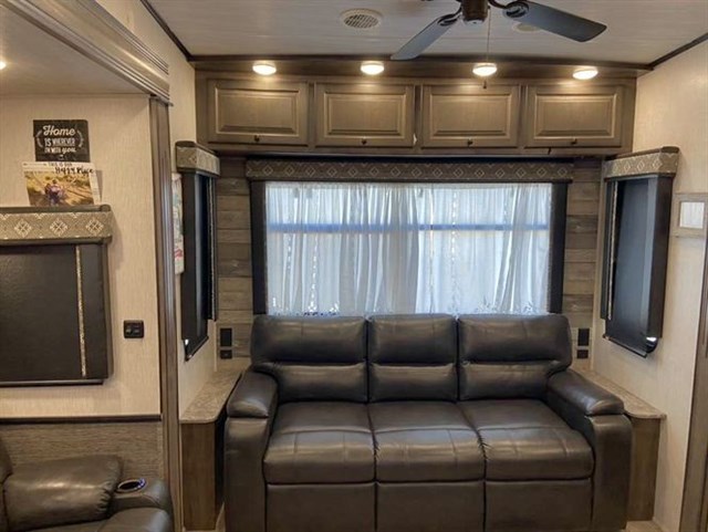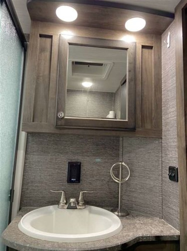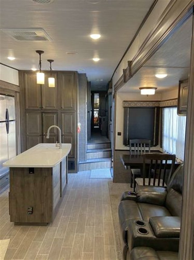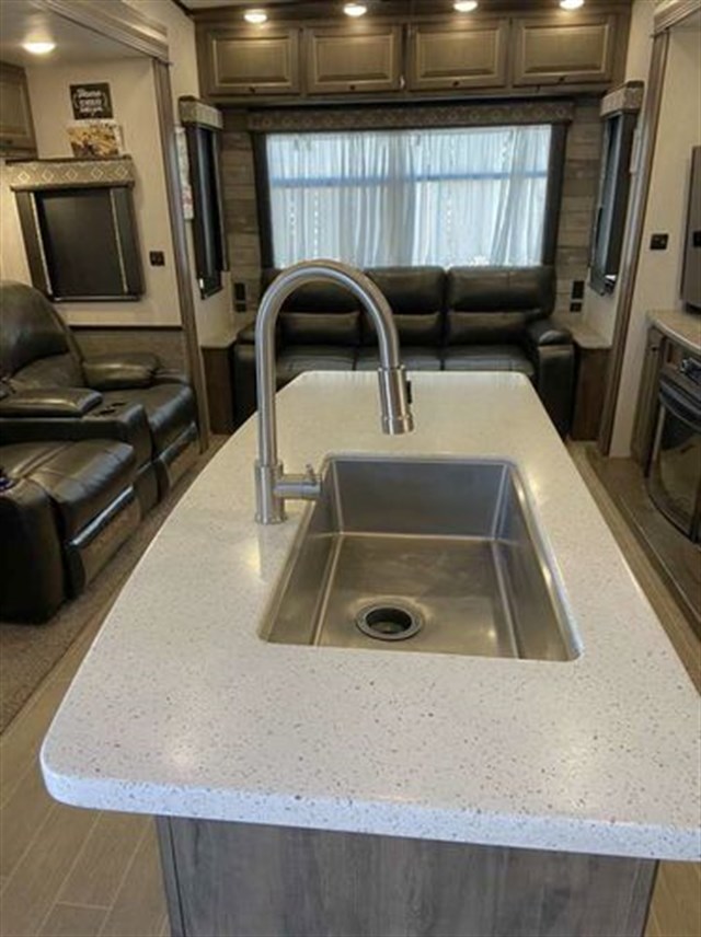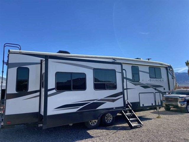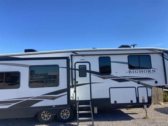 When you adventure out in a Heartland Bighorn Traveler full-profile fifth wheel, you will appreciate the 6-point hydraulic level-up as you set up camp for a weekend getaway or extended vacation. The electric awning with LED lighting offers protection from the hot sun during the day and extra light for hanging around the campsite in the evening. Inside of each Bighorn Traveler you will enjoy the class and style that the one-piece fiberglass shower and solid surface backsplash add to the interior and much more!
