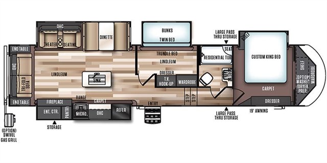 As you enter, straight in front of you there is a bedroom/bunkhouse with TV hook-up, a dresser, and wardrobe on one side. The opposite side of the room has a slide out set of bunks with a trundle bed below. Your kids will love having their own space in this fifth wheel.