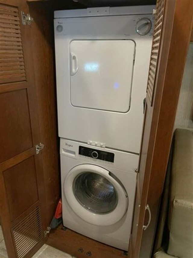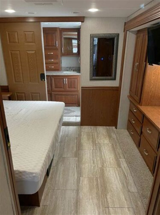 As you enter the motor home, the passenger side has a TV mount, double kitchen sink, three burner range, microwave, and is washer and dryer prepped. The driver's side of the motor home offers a full wall slide with a sofa, booth dinette, refrigerator, pantry with adjustable shelves, closet, two shirt wardrobes, a chest of drawers, and a TV mount in the bedroom.