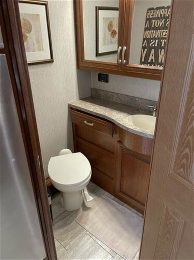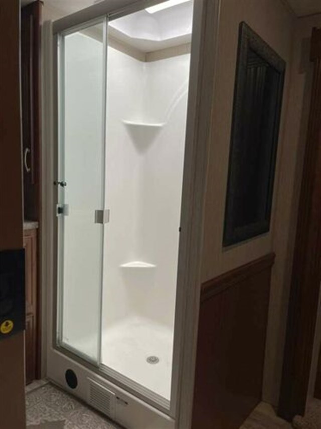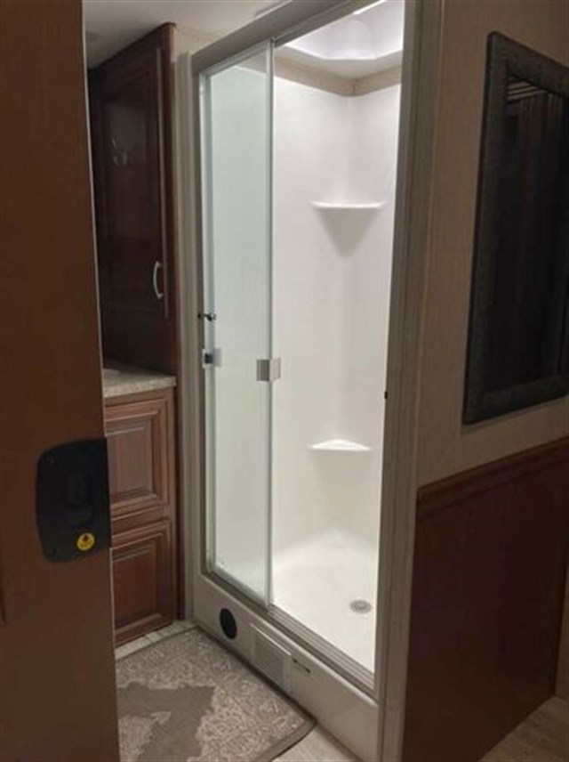 The bedroom also offers a queen bed slide. The master bath is quite spacious with a toilet, two sinks, linen closet, and shower, plus so much more!