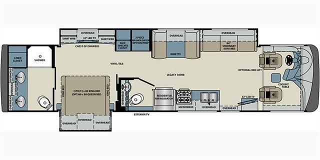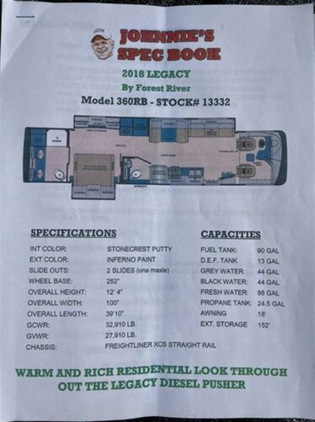 The Legacy 360RB class A diesel motorhome by Forest River offers a rear bath and a full wall slide.
