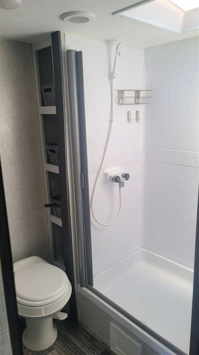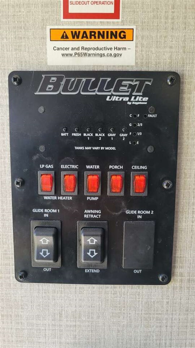 Load up your family and head out to a quiet retreat at your favorite campground with this Bullet travel trailer by Keystone. Before you head inside, in the evening, you can sit underneath the 20' electric awning with LED lights and enjoy the scenic sunset. Inside this model you will love how open and spacious the kitchen and living area feel with the single slide. The large bathroom is in the rear of this trailer, and the front, private bedroom has a sliding door and plenty of storage.