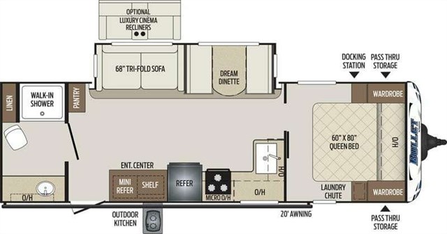 Whether you're spending your time soaking up the sun at the edge of the lake or trekking into the forest on a hunt for fresh berries, the Keystone Bullet travel trailer will not only get you to your destination, but it will also keep you happy while you're there. With the most luxury features of any other ultra lite trailer, like the exterior speakers, laundry chute, and LED lighting, the Bullet continues to provide the number one ultra lite travel trailer in America. Because of the contoured shape of the radius front profile on the Bullet, it offers less wind resistance as you tow it along the highway, and when you combine that with the extremely lightweight floor plan design, you get one unit that will help you cut costs when spending money on fuel.