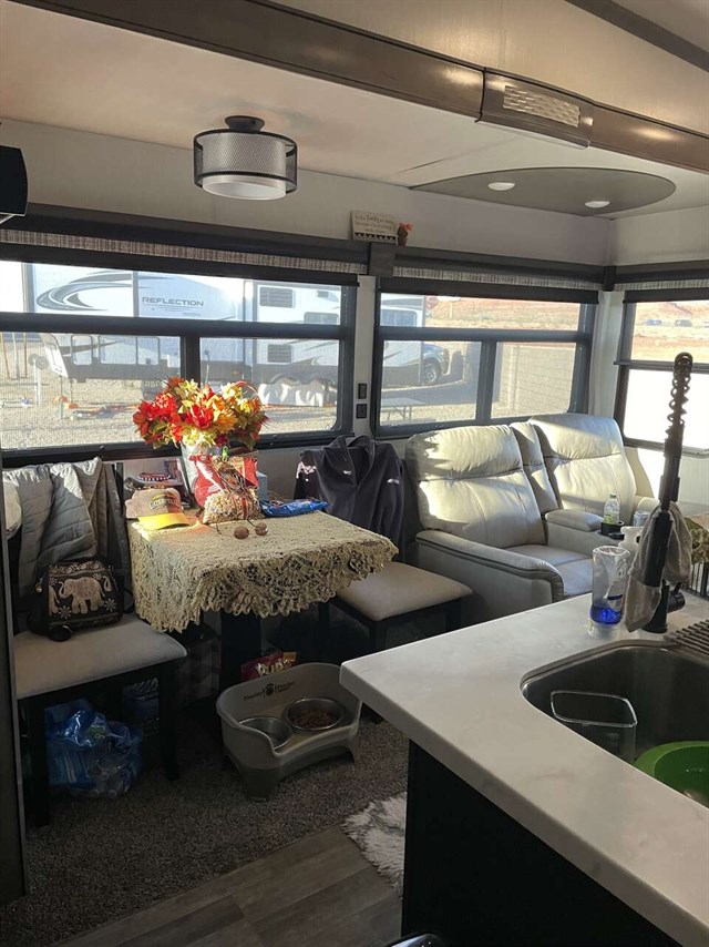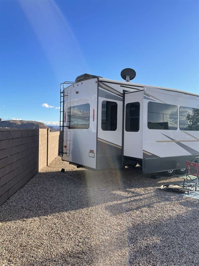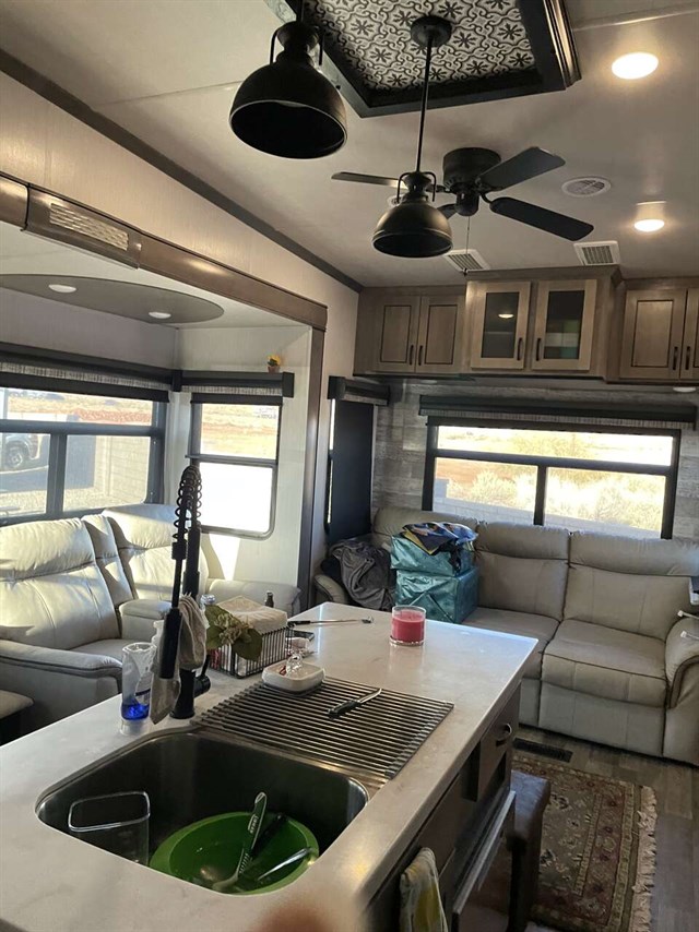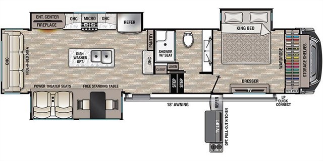 You won't want to camp any other way once you enter this fifth wheel! It features a front private bedroom with a king bed to enjoy a goodnight's rest on, a full wall wardrobe with storage shelves and an area prepped to add the optional washer and dryer. The full bathroom has a shower with a seat and a skylight above it for natural lighting as you get ready at the large vanity sink with two faucets, plus there is a linen closet to store your towels. The kitchen has everything you will need to prepare a delicious home-cooked meal including extra counter space next to the kitchen pantry and the kitchen island with the optional dishwasher too! The rear living area is the perfect place to wind down your nights by relaxing on either the hide-a-bed sofa or the power theater seats with cupholders and USB charging ports across from the entertainment center with a fireplace and 50" TV.