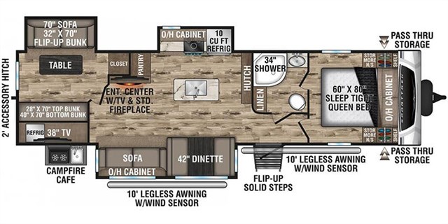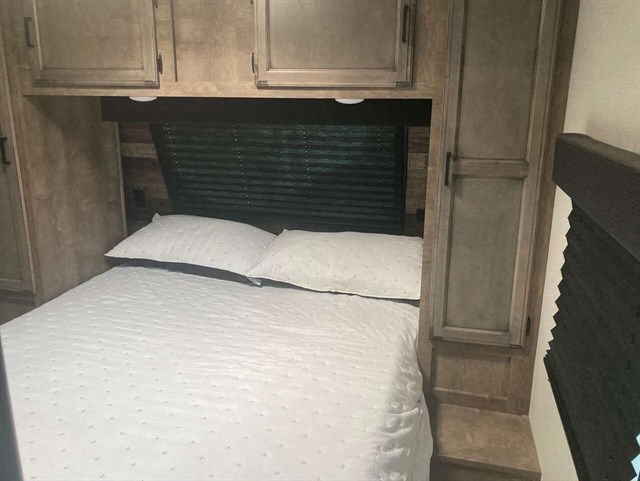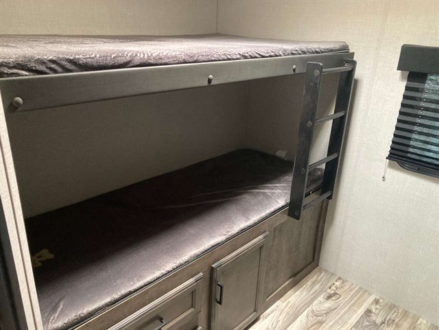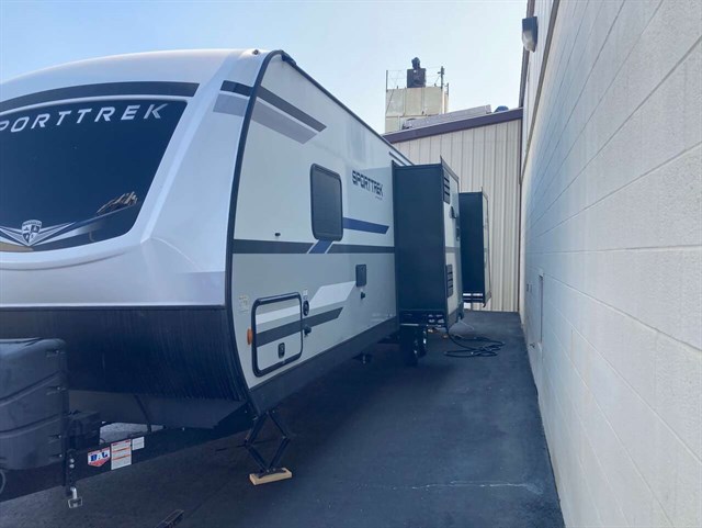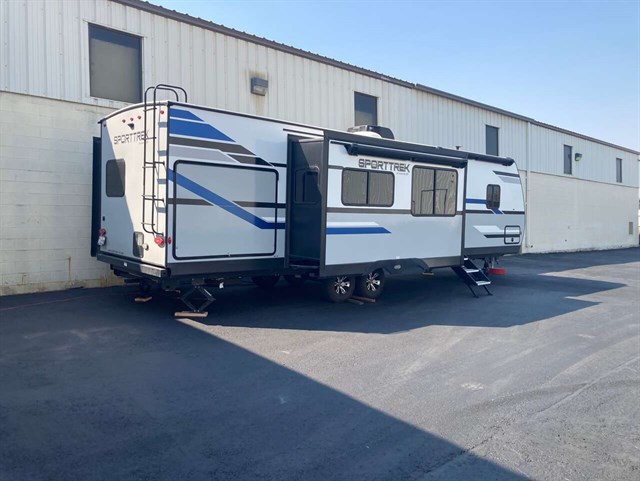 Traveling to see new campgrounds while you work from any destination is available in this SportTrek travel trailer. You will see that the bunkhouse can be utilized as an office, guest room, or your kid's private bedroom. Just imagine your spouse making breakfast inside after fishing or riding your bike, and you will enjoy cooking on the exterior campfire cafe when it's dinner time. You two and your guests/kids can eat meals outside under one of the two electric awnings or inside at the dinette and sofa. Your bedroom includes a designer padded headboard on a queen Sleep Tight mattress and plenty of storage for all your clothing.