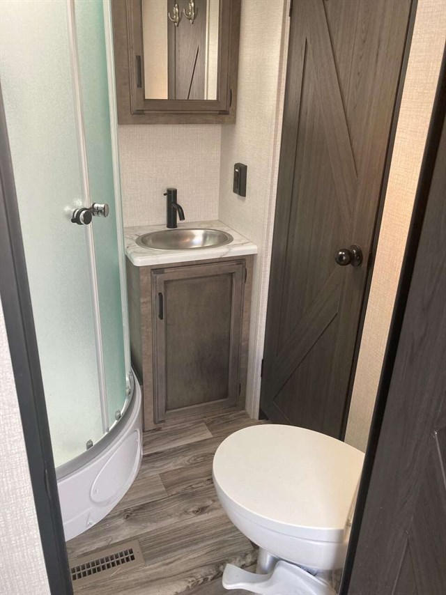 With any SportTrek travel trailer by Venture RV, you will appreciate the NXG huck-bolt frame because it provides a strong and lightweight foundation. Once at your destination, the exclusive-to-Venture RV Level Mate PRO offers leveling simplified, on the first try! Inside you will find plenty comforts of home, plus a handy shelf next to the bed with a USB port for charging mobile devices and space and much more!