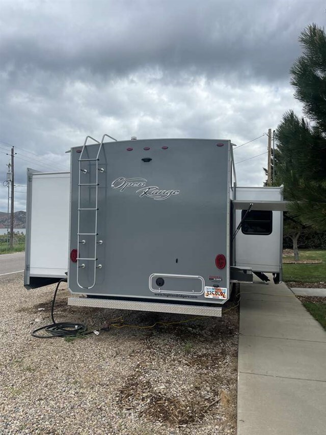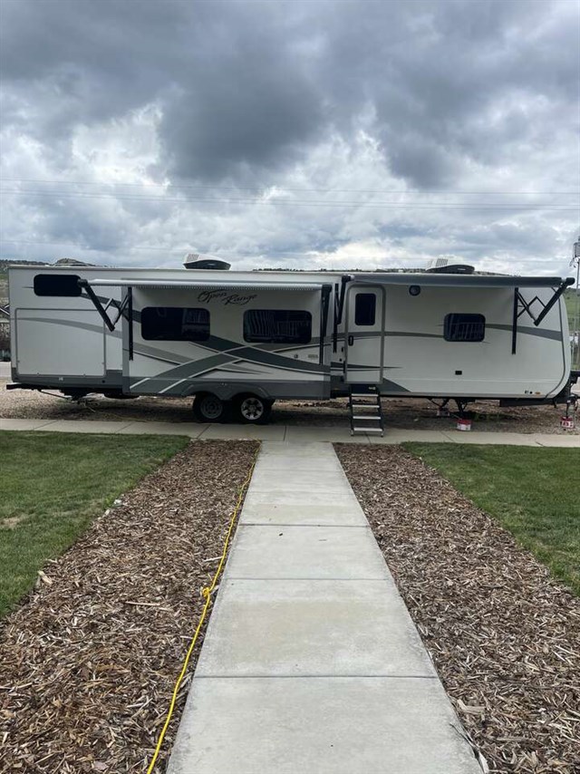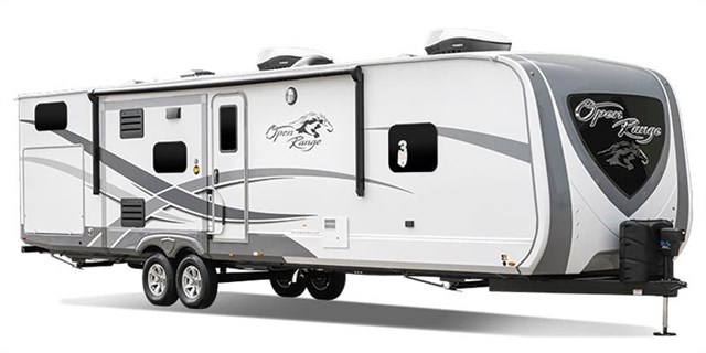 Highland Ridge RV Open Range travel trailer 338BHS highlights: Rear Bunkhouse w/Half Bath Dual Entry Full Bathroom Kitchen Island Fireplace Outside Kitchen