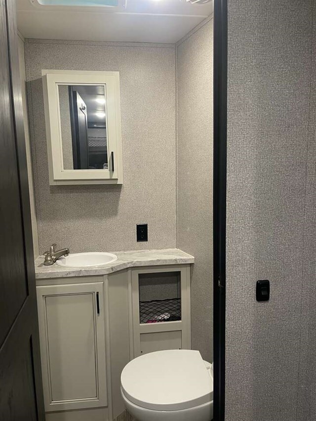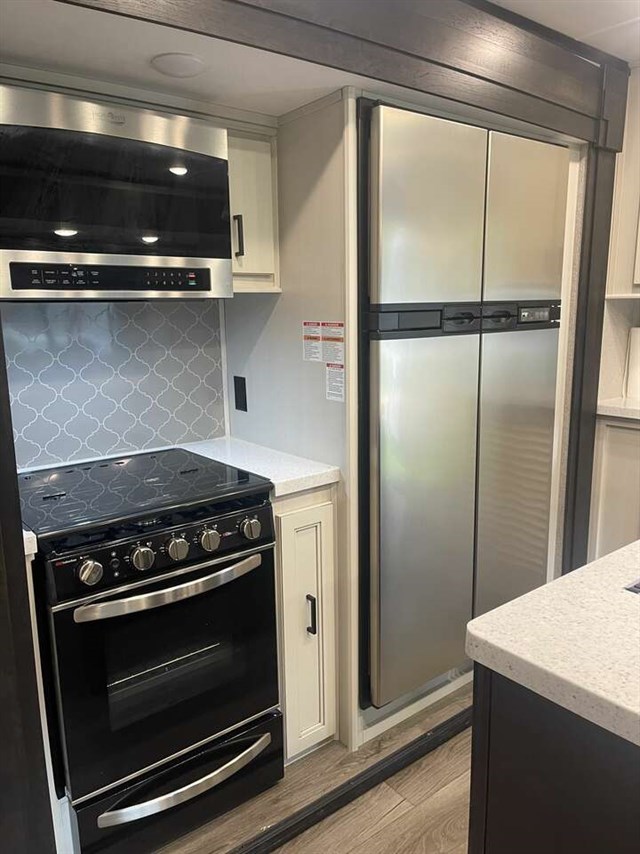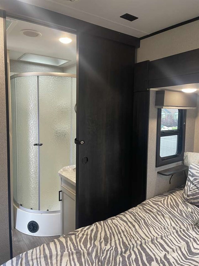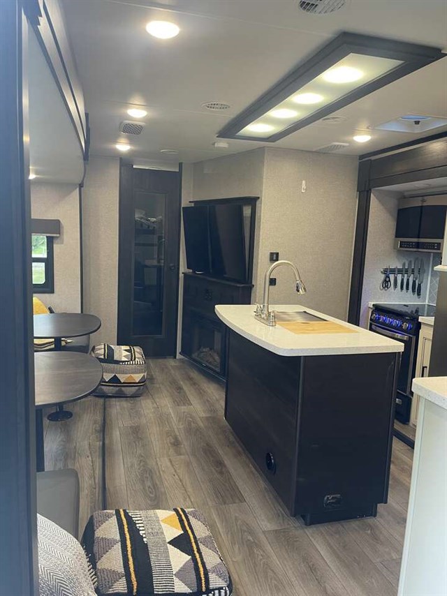 Four slides open up this travel trailer for plenty of walking around space! The kiddos or your guests will enjoy their own privacy in the rear private bunkhouse which has a flip-up bunk above a booth dinette slide, a bunk with bench seat below, a hutch, and a half bathroom for convenience at night. Everyone can gather around the U-lounge slide for meals or set up a table and chairs underneath one of the two 11' 6" power awnings and cook dinner at the outside kitchen. The dual entry bathroom has a radius shower to freshen up in each morning, a linen closet to keep your towels in, and an entrance into the front private bedroom. A King Bed Washer and Dryer hook-ups are in the main bedroom.