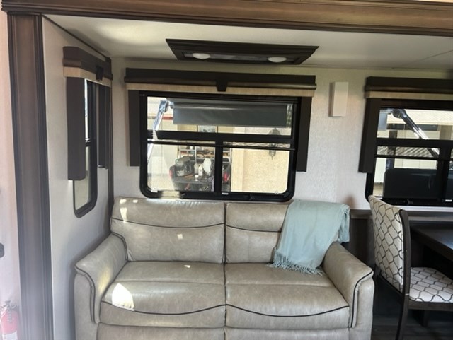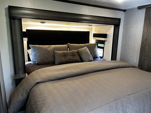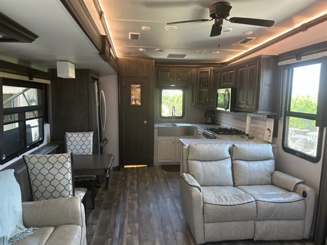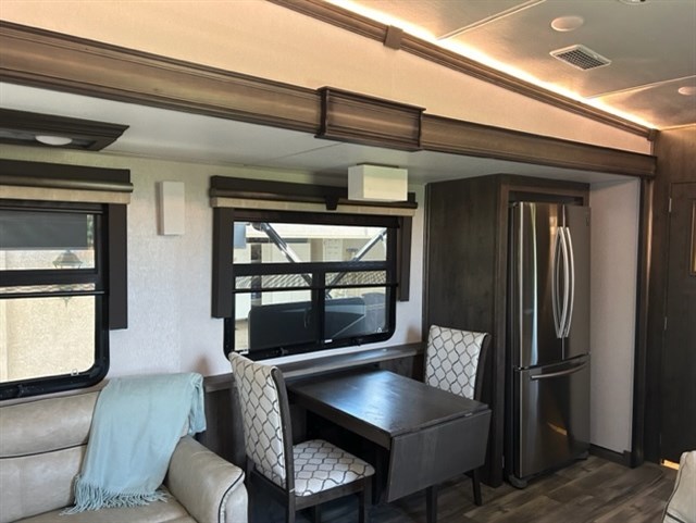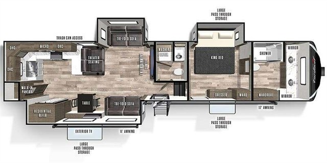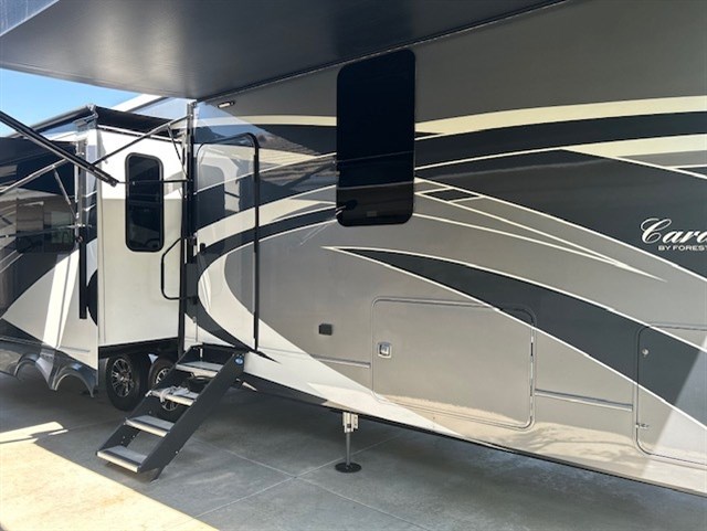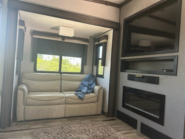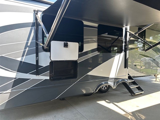 In any Forest River Cardinal Luxury fifth wheel, you will find comfort and convenience both inside and out as these units were built with your enjoyment in mind. Each unit features a vacuum-bonded, welded aluminum structure and includes a “Level Up” 6-point one-touch automatic hydraulic leveling system. Each Cardinal Luxury model also has chambered frame technology and a hydraulic slide system with 2.5" steel rams. You will also appreciate the at-home touches on the interior that give each unit a luxurious feel like the crown molding ceiling and cabinet trim, the electric fireplace, the full-height hanging wardrobe, and the pendant lighting in the kitchen area. The outside of this model also has a high-end look with its premium high-gloss gel-coat fiberglass!