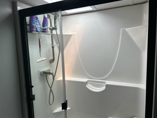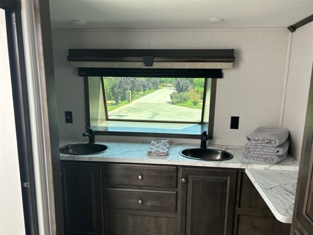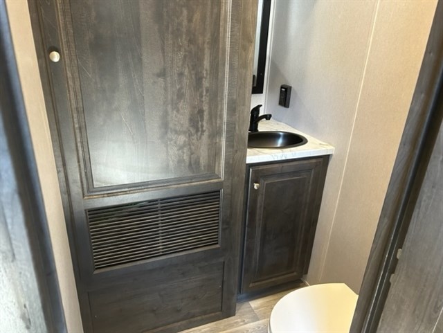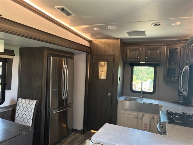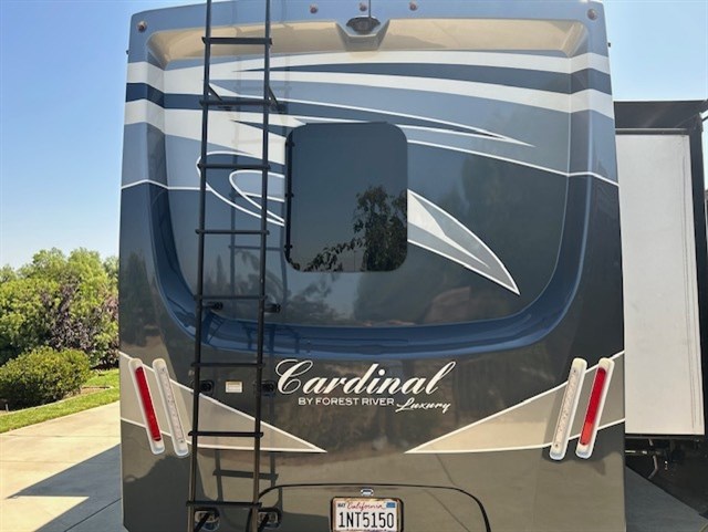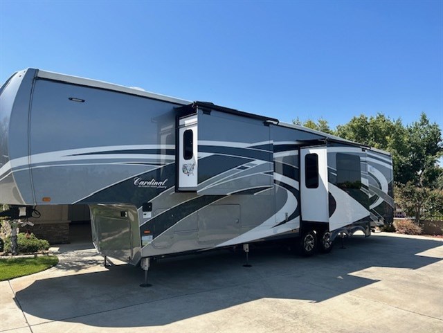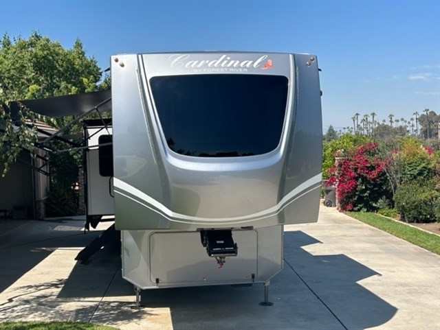 As amazing as this Cardinal Luxury fifth wheel is, you will never want to leave! Whether you're spending a relaxing evening up front in the master suite using the dual-sink vanity in the full bathroom, or you're back in the rear kitchen whipping up some delicious treats and storing them in the Hisense four-door refrigerator, you will be thoroughly cared for with all of the many exceptional amenities found on this model. The living area is supremely comfortable with its two tri-fold sofa slides, its theater seating, its 50" LED TV, and its fireplace. Plus, the additional half bath that is directly in front of the main entry door makes it super convenient to come in and use the bathroom while you are outside playing a round of corn hole.