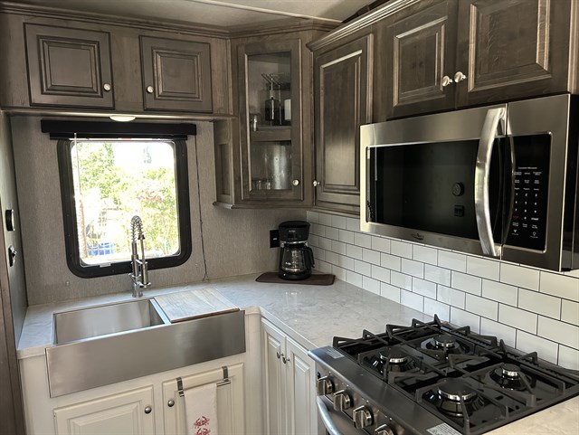 The living area includes a central vacuum system, guest bathroom, tongue and groove plywood floor, solid surface kitchen countertops, pantry, farmhouse sink, and a residential refrigerator, microwave, and residential range with solid surface backsplash.