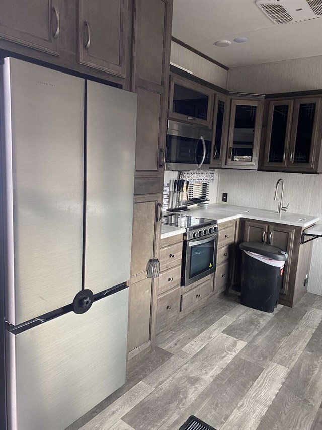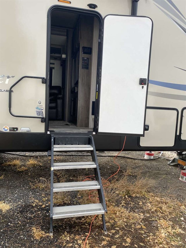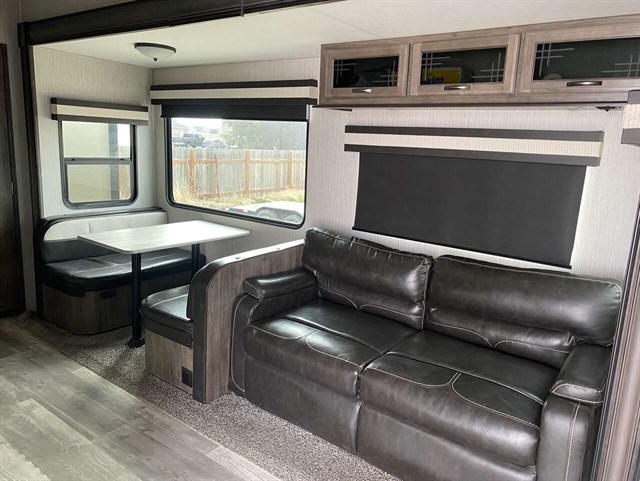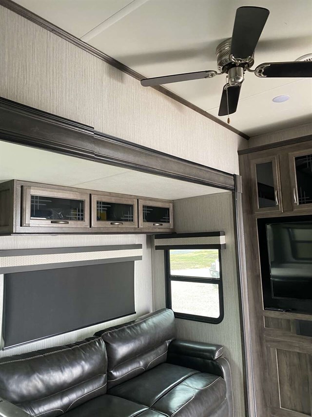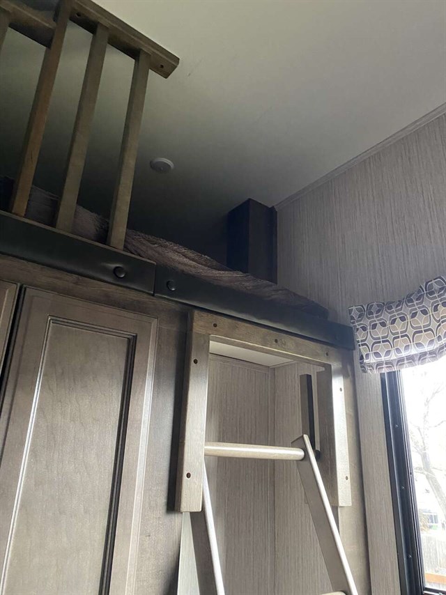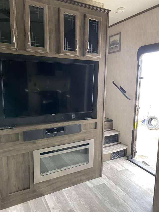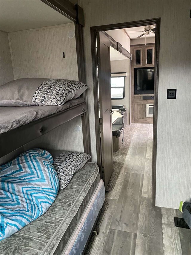 This family friendly RV offers a private bunkhouse with a glide sofa with a bunk above, and a ladder to the loft area that is above the full bathroom. This full bathroom includes a shower/tub and the second entry/exit. You will have your own private bedroom with access to private full bathroom with a radius shower, plenty of storage and a slide out with a wardrobe and linen closet that stretches into the bathroom. The main living and kitchen area is spacious and offers a 50" flat screen TV, right above the electric fireplace, a ceiling fan, and all the appliances plus a full pantry, and a 17 cu. ft. refrigerator. You can also use the bumper mount swivel gas grill and outside refrigerator, and enjoy the outdoors under the 21' "One Touch" electric awning. Includes a puck system 5th wheel hitch. All reasonable offers will be considered.