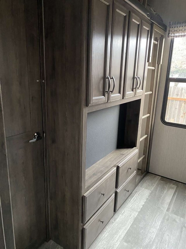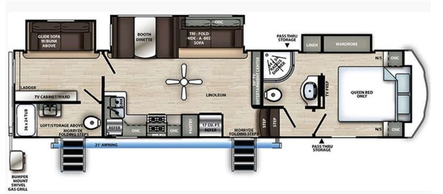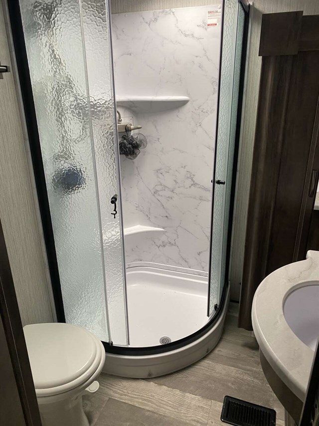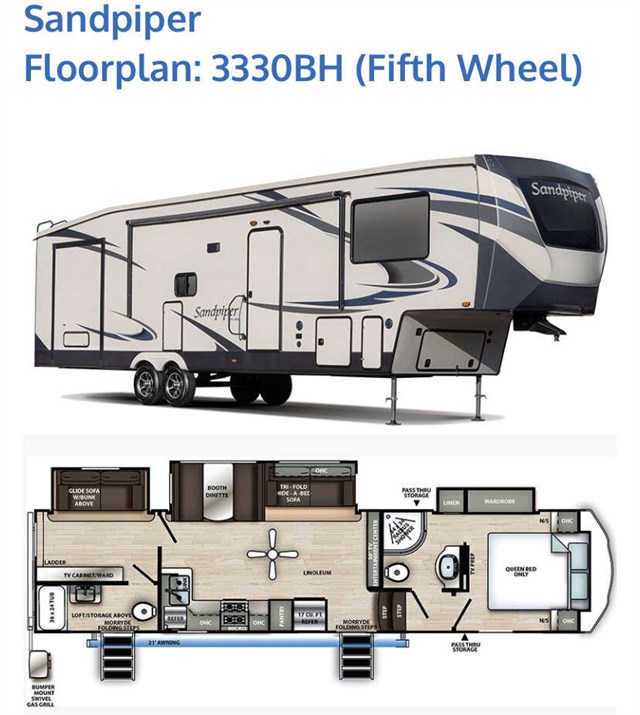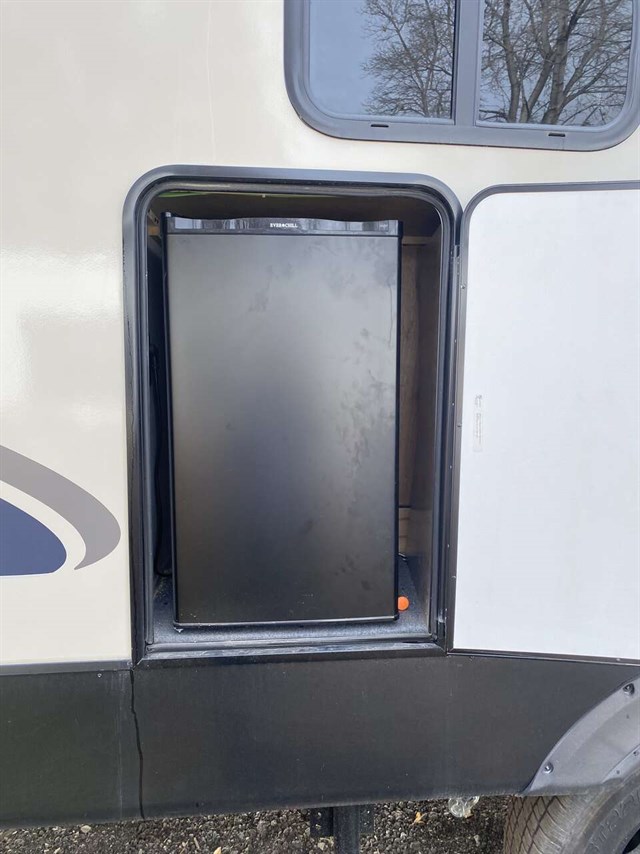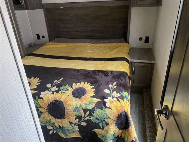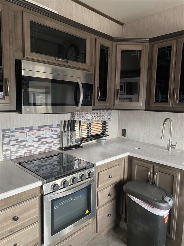 This family friendly RV offers a private bunkhouse with a glide sofa with a bunk above, and a ladder to the loft area that is above the full bathroom. This full bathroom includes a shower/tub and the second entry/exit. You will have your own private bedroom with access to private full bathroom with a radius shower, plenty of storage and a slide out with a wardrobe and linen closet that stretches into the bathroom. The main living and kitchen area is spacious and offers a 50" flat screen TV, right above the electric fireplace, a ceiling fan, and all the appliances plus a full pantry, and a 17 cu. ft. refrigerator. You can also use the bumper mount swivel gas grill and outside refrigerator, and enjoy the outdoors under the 21' "One Touch" electric awning. Includes a puck system 5th wheel hitch. All reasonable offers will be considered.
