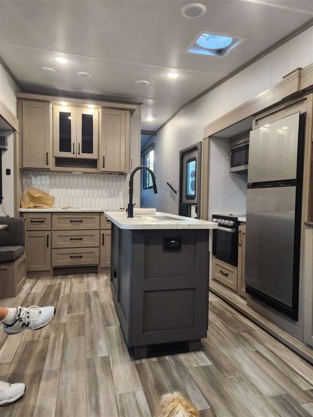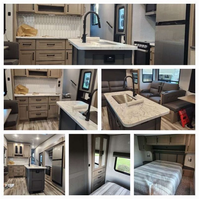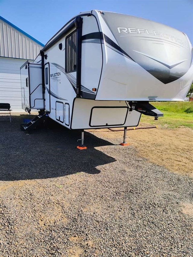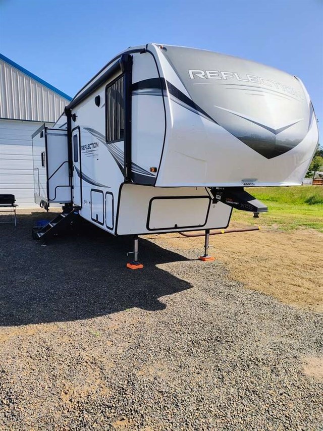 With any Reflection 150 Series fifth wheel by Grand Design, there is more available payload capacity and a broader range of half-ton trucks capable of towing this fifth wheel, and no slider hitch is needed thanks to the 90-degree turning radius which makes them short bed friendly and easier to tow. The mandatory Ultimate Power package provides a "One-Touch" automatic leveling system and a detachable power cord with LED light for easy setup, plus motion sensor pass-through lighting and entry lighting, and the Tire Linc TPMS will help you stay safe on the road. The interior offers residential luxury from the cabinetry and gunstock hardware plus the booth dinette to the residential-style window treatment.