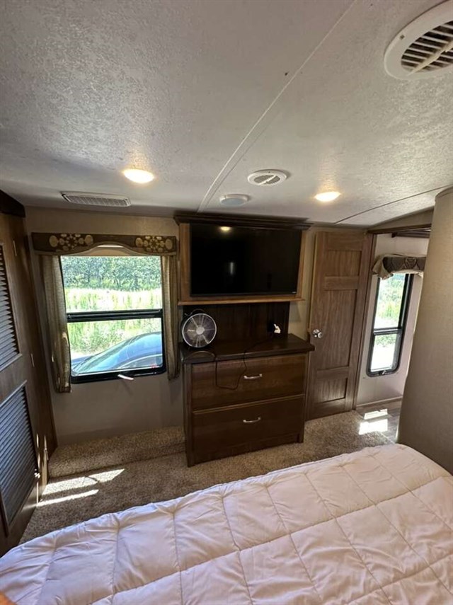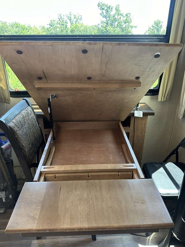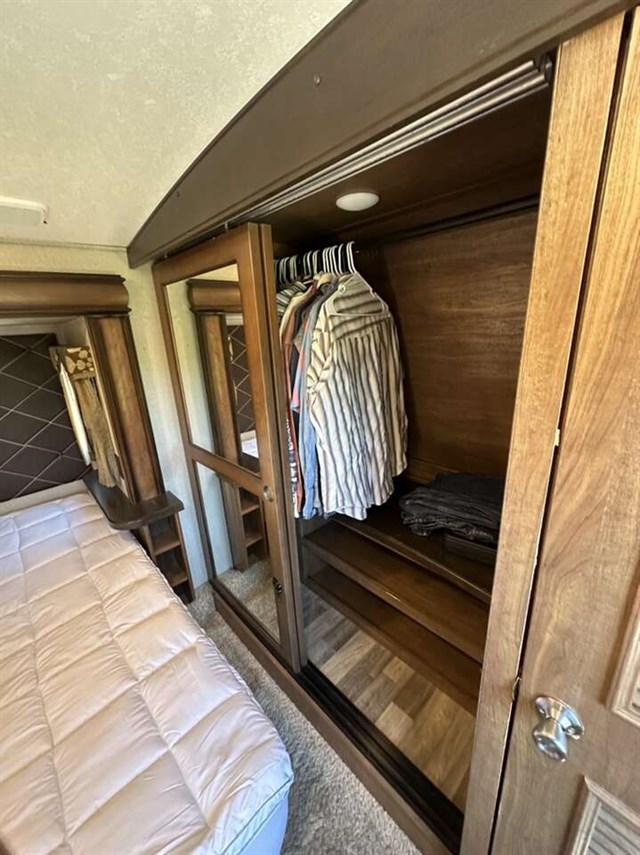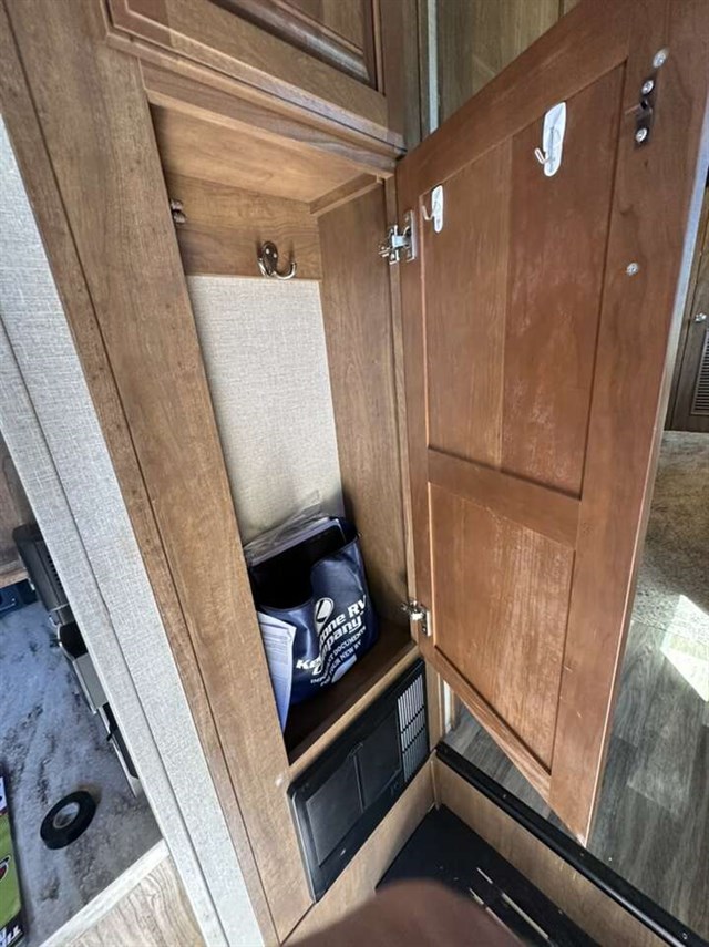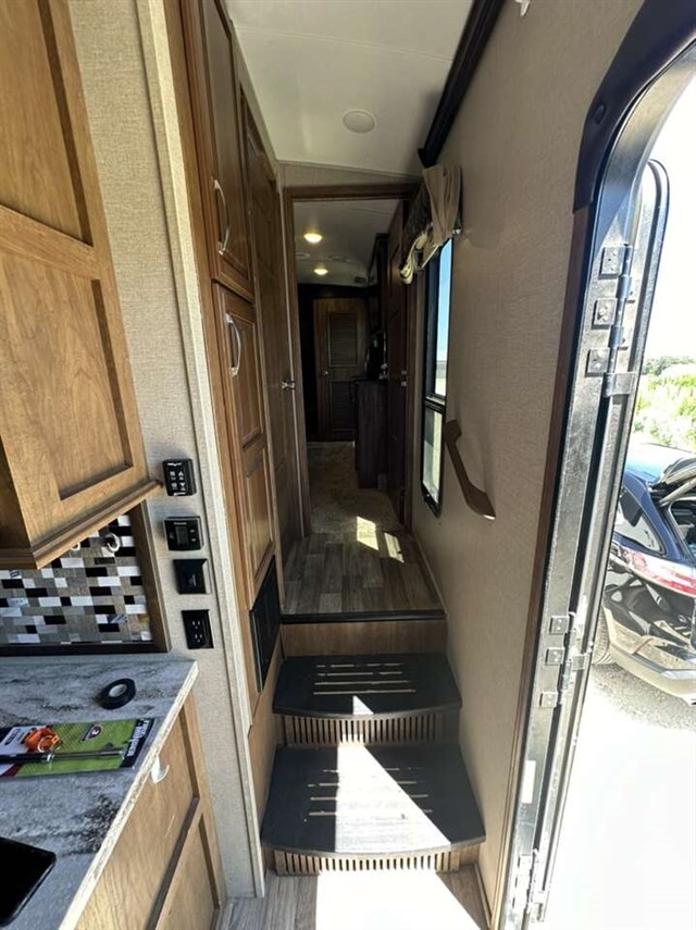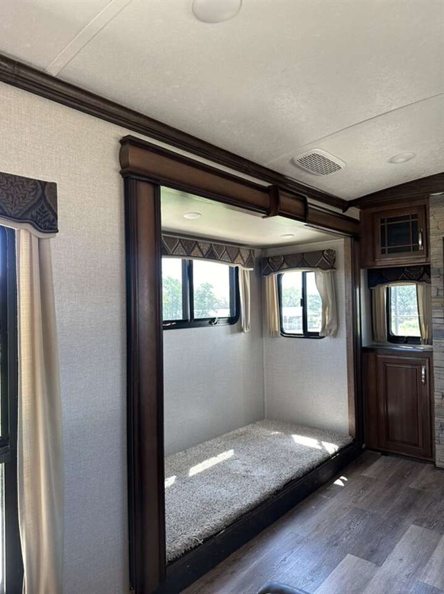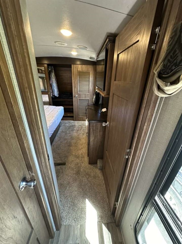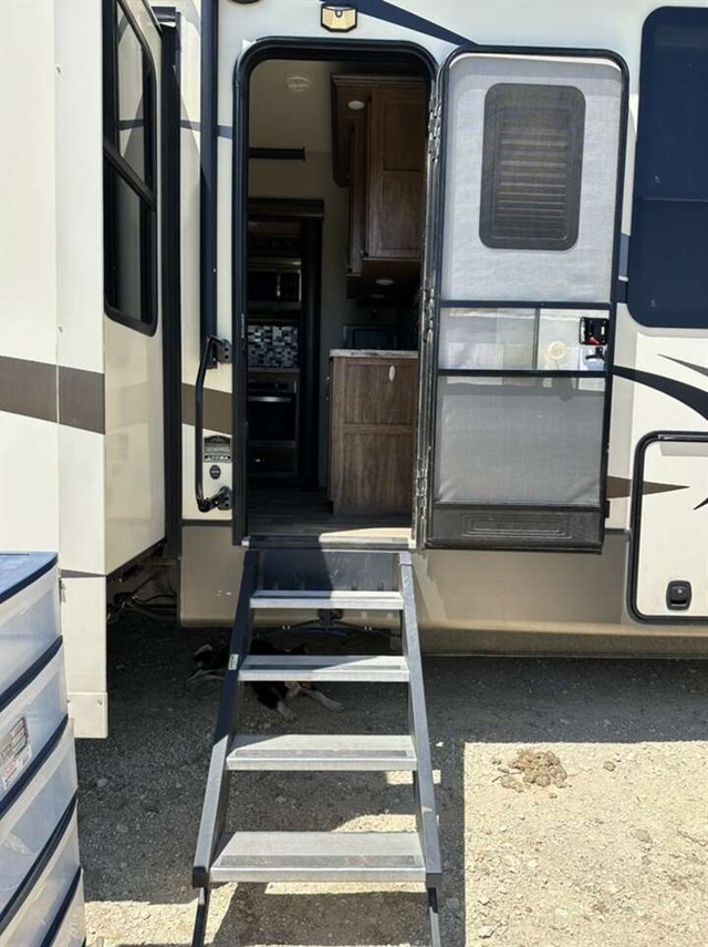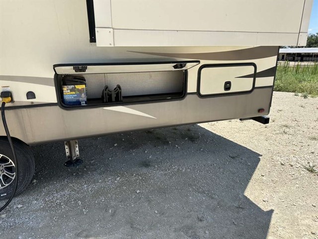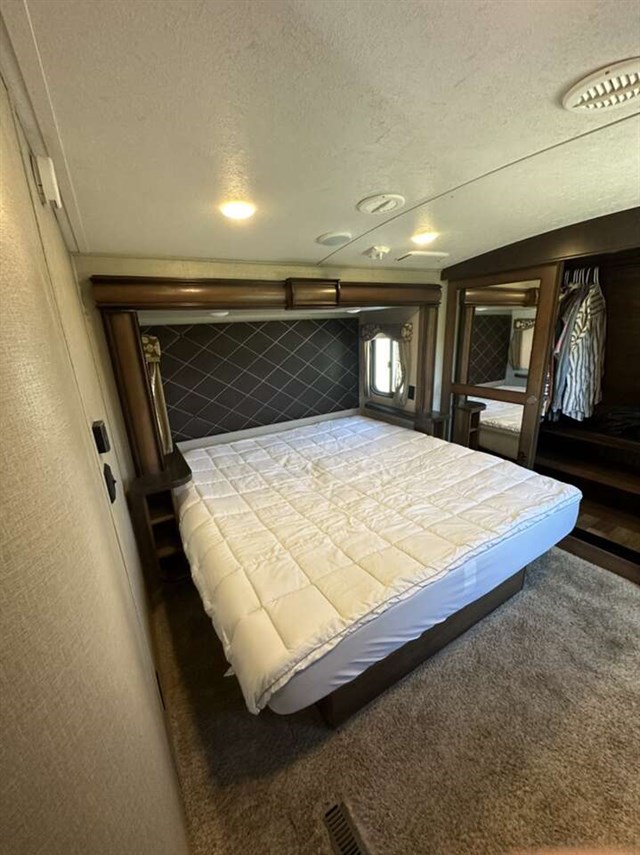 Other features you will appreciate include Dexter E-Z Lube axles, Max Turn front cap and radius frame, an enormous drop frame pass-through storage compartment, rear storage compartment with a sliding cargo tray, rear receiver hitch for accessories, power patio awning, dual heat pump ACs, rear ladder, upgraded roller shades, auto leveling system, backup camera prep, a Winegard Razor non-cranking digital antenna, frameless windows, 12 gallon water heater, residential ceiling fan, 50 amp electric service, Four Seasons Living package included, LED lighting and so much more!