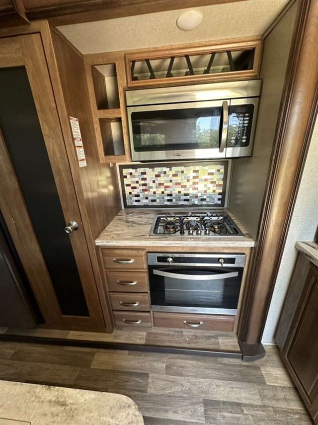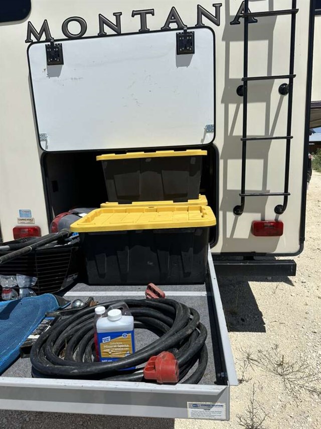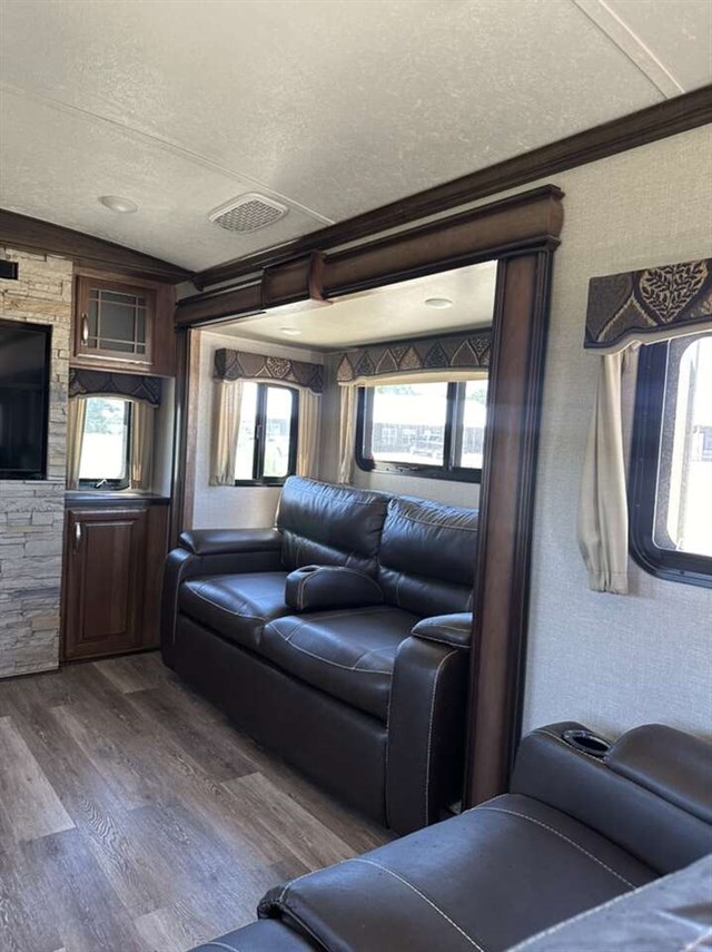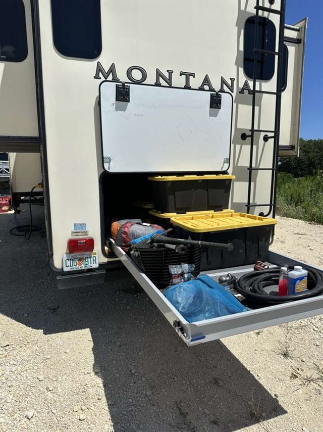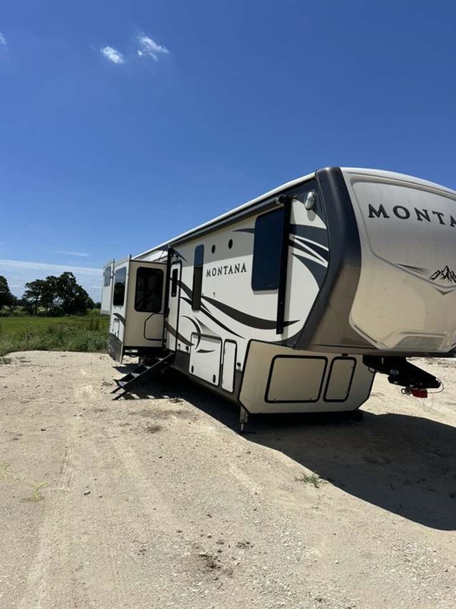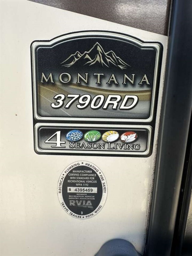 Model 3790RD with 5 slide-outs. Your friends and family will enjoy all the space inside this luxurious Montana. This fifth wheel features a large rear living room with 2 opposing slide-outs, dual facing hide-a-bed sofas, power reclining theatre seating facing the electric fireplace and large LED TV. The chef will enjoy the island kitchen with 2 additional slide-outs, tons of storage in the beautiful cabinetry, solid surface countertops, a lg. hutch, db. sinks, 3 burner LP cooktop with oven, convection microwave, a nice pantry net to the 4 door RV refrigerator and dining table with chairs.