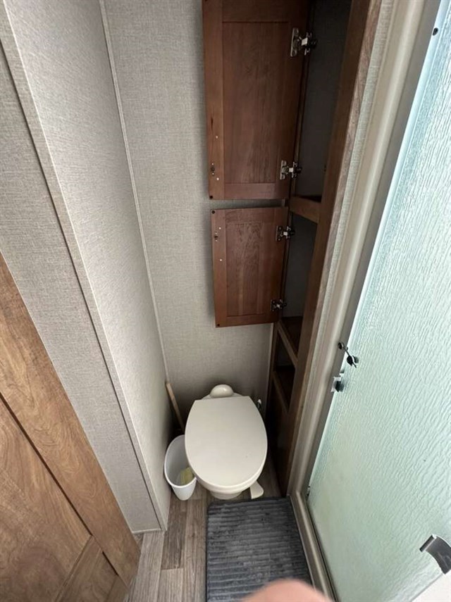 Moving forward up a couple steps is the master bath with a 48 X 35 inch seamless fiberglass shower with seat, vanity sink, medicine cabinet, porcelain toilet and linen closet. The private master bedroom features a island king bed with storage underneath, nightstands, a large wardrobe, HDTV, plenty of storage shelves, a dresser with drawers and dedicated closet for a washer/dryer combo.