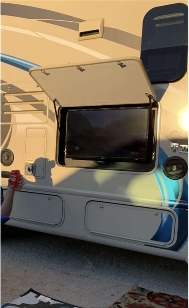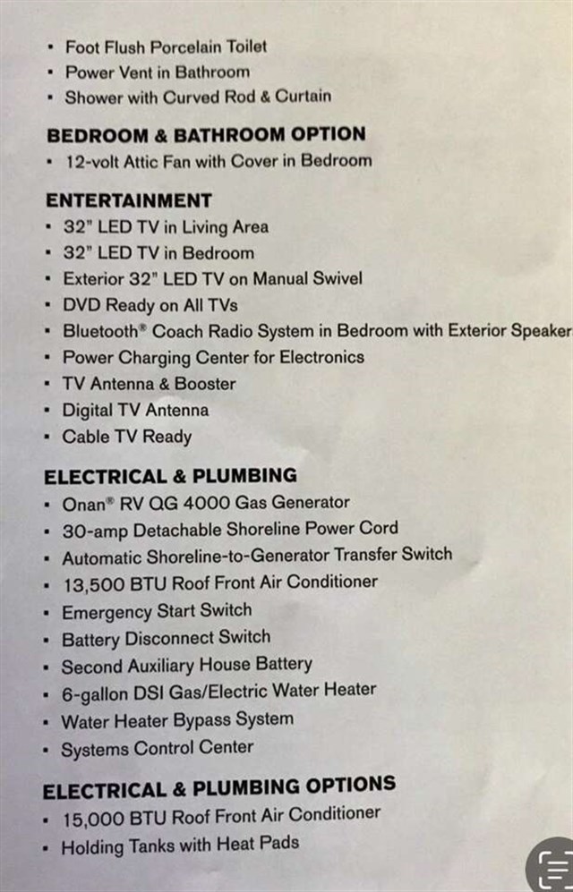 Onan 4000 gas generator, power slide out, 16’5” power awning with LED lighting. Outdoor entertainment system with 32” tv, outdoor shower, plenty of undercarriage storage. Heated mirrors and holding tank heat pads.