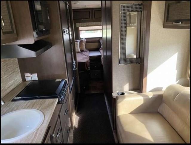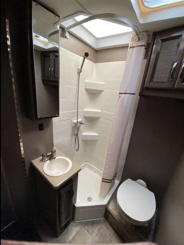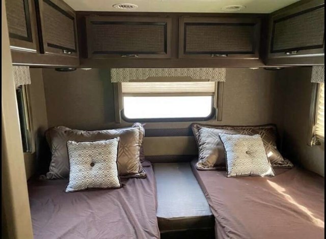 Sleeps 6, back bed can be 2 twin beds or concerts to king size bed. Couch makes into a queen bed and there is a power drop full size hideaway overhead bunk bed, (1) slideout room, LED lighting throughout, privacy shades on all windows, 82” ceiling height, double door refrigerator, 3 burner gas cooktop, oversized sink, convection microwave oven, flush porcelain toilet, (3) 32” tvs and Bluetooth entertainment system with speakers inside and out. There is a dash workstation with 120V and 12V outlets and charging station. Reclining swivel captain’s chairs and stow away tables. Plenty of storage in and out! The master bedroom is great and one of the reasons while you'll love this floorplan since there is no BR slideout you can leave your bed made when you pull out and move on to another destination.