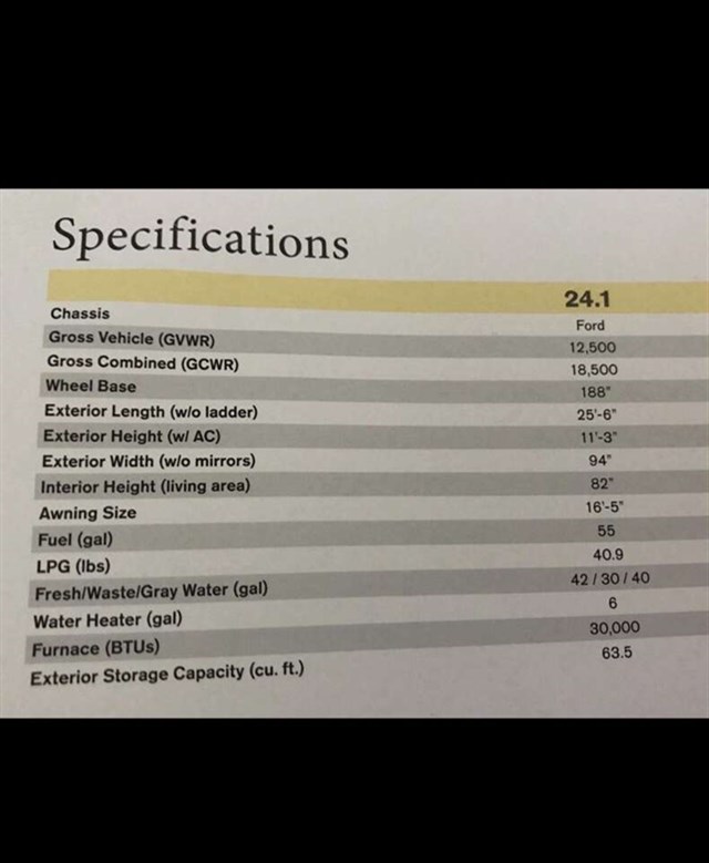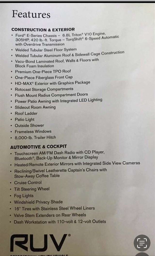 Waldo likes to brag about his Ford chassis, V10 engine, 305HP, 420lb-ft torque, 6 speed automatic, with overdrive transmission with cruise control. He is strong and has a 8,000 lb trailer hitch that will pull your boat, trailer or car! Waldo has back up and mirror cameras for easy viewing! He has all the equipment and options needed to take you where you want to go in luxury!