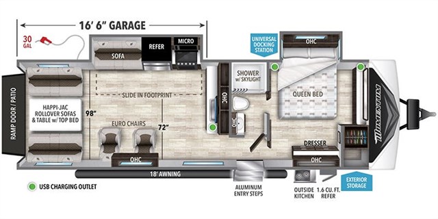 Queen-sized bed in the master bedroom - Two HappiJac sofas that convert to a bed, plus an overhead bunk in the garage - Fully-equipped kitchen with stainless steel appliances and ample storage - Spacious living area with recliners and an entertainment center - Full bathroom with a large shower and skylight Garage Details: