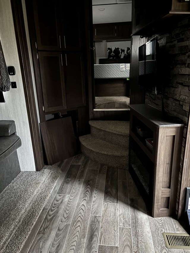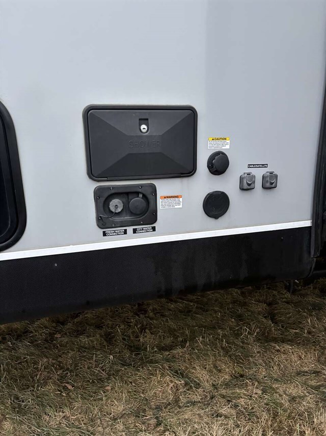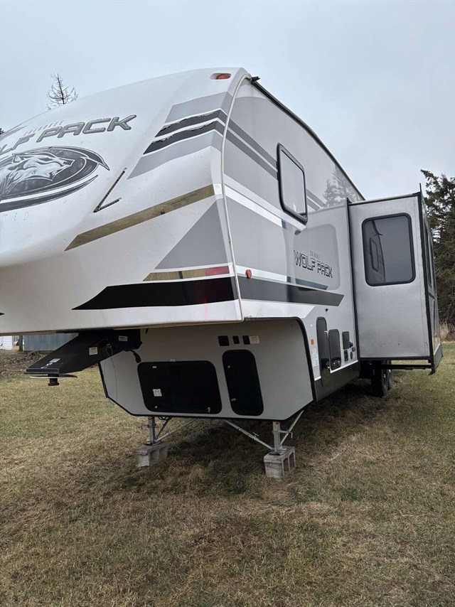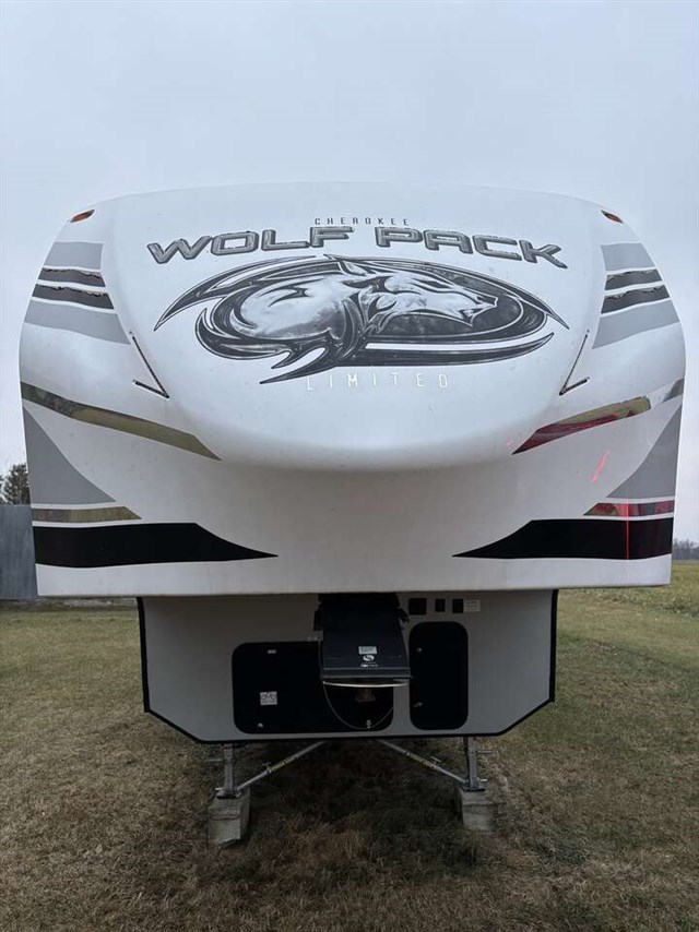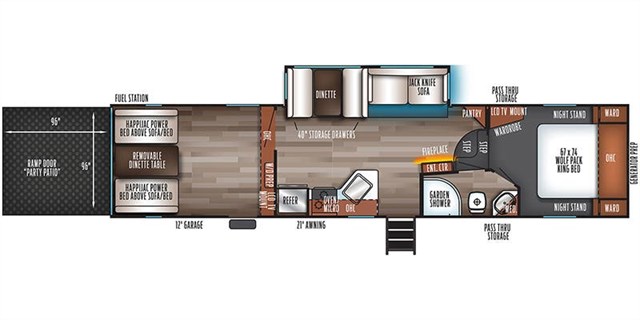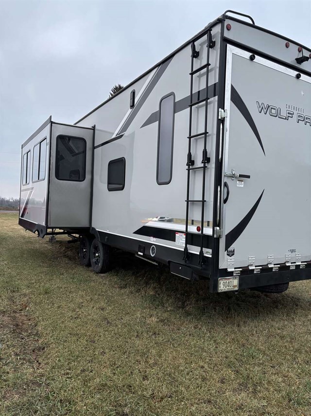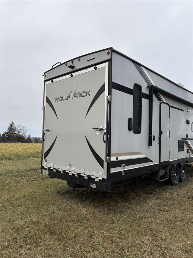 This fifth wheel toy hauler sleeps 8 people . Length is 39'3 and it's 8'6 wide and 13'5 height. Center living room with a hide a bed sofa table makes into a bed and has a Tv and fireplace. TV in the garage that is 12' with a queen happy jack double beds washer dryer ready spring loaded ramp door. Has a 21' awning. 30 gallon gas tank generator ready. Kitchen has a microwave with a 3 burner stove. Lots of storage has a tandem axel with upgraded tires.
