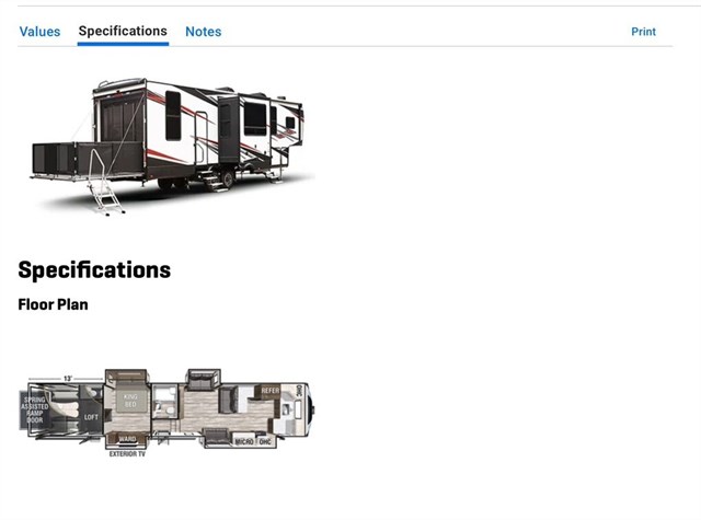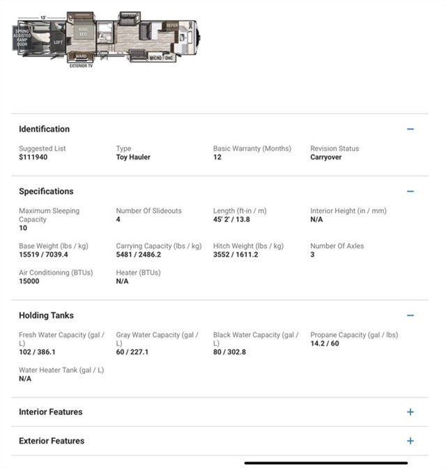 Specs: Length: 45.17' | Weight: 15519.0 lbs | Slide Outs: 4 | Sleep Number: 6 | Exterior Height: 13.33' | Fresh Water Tank: 102.0 gal | Black Water Tank: 80.0 gal