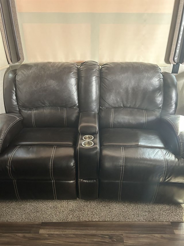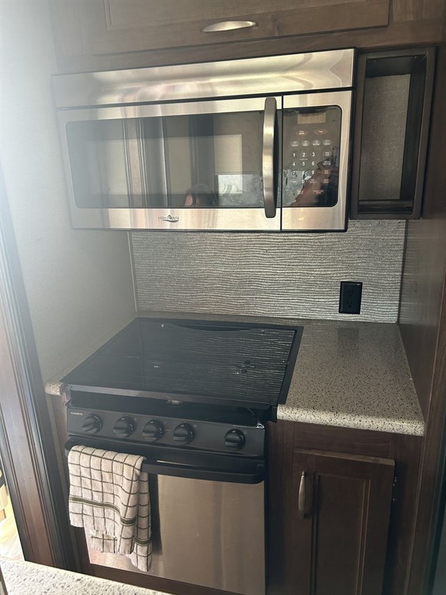 Key Amenities: Kitchen island with solid surface countertops, Furrion 21" oven/cooktop, 30" microwave, residential refrigerator option, electric fireplace, and a reclining theater seating area.