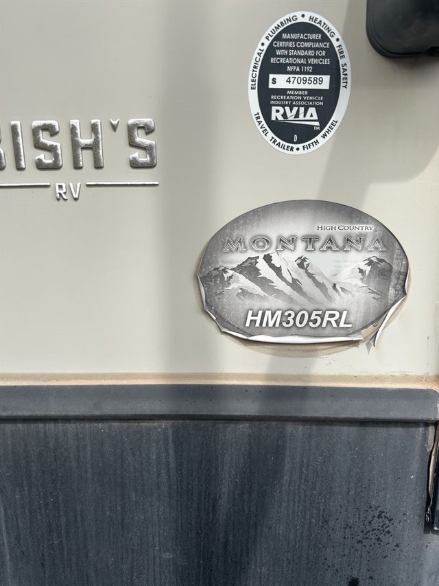 The 2019 Keystone Montana High Country 305RL is a triple-slide, rear-living luxury fifth wheel. It features a kitchen island, front bedroom, and a fireplace, measuring approximately 32 feet in length and designed for lighter towing compared to standard Montana models. It typically sleeps 5, featuring a queen sofa bed and residential-style amenities.